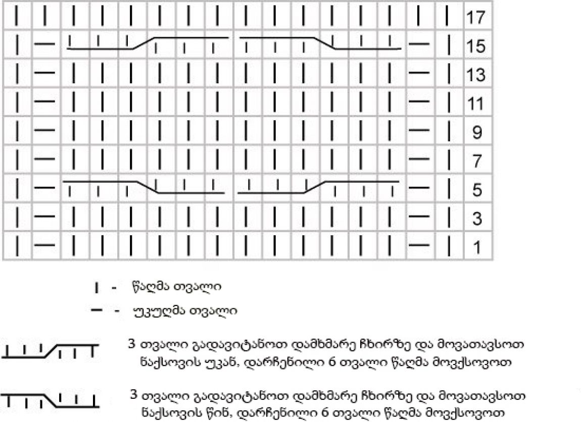 1 й ряд (лиц. сторона): 7 изн., 6 лиц., 7 изн.2-й ряд: 7 лиц., 6 изн., 7 лиц.3 ряд- как первый; Четвёртый как второй;
