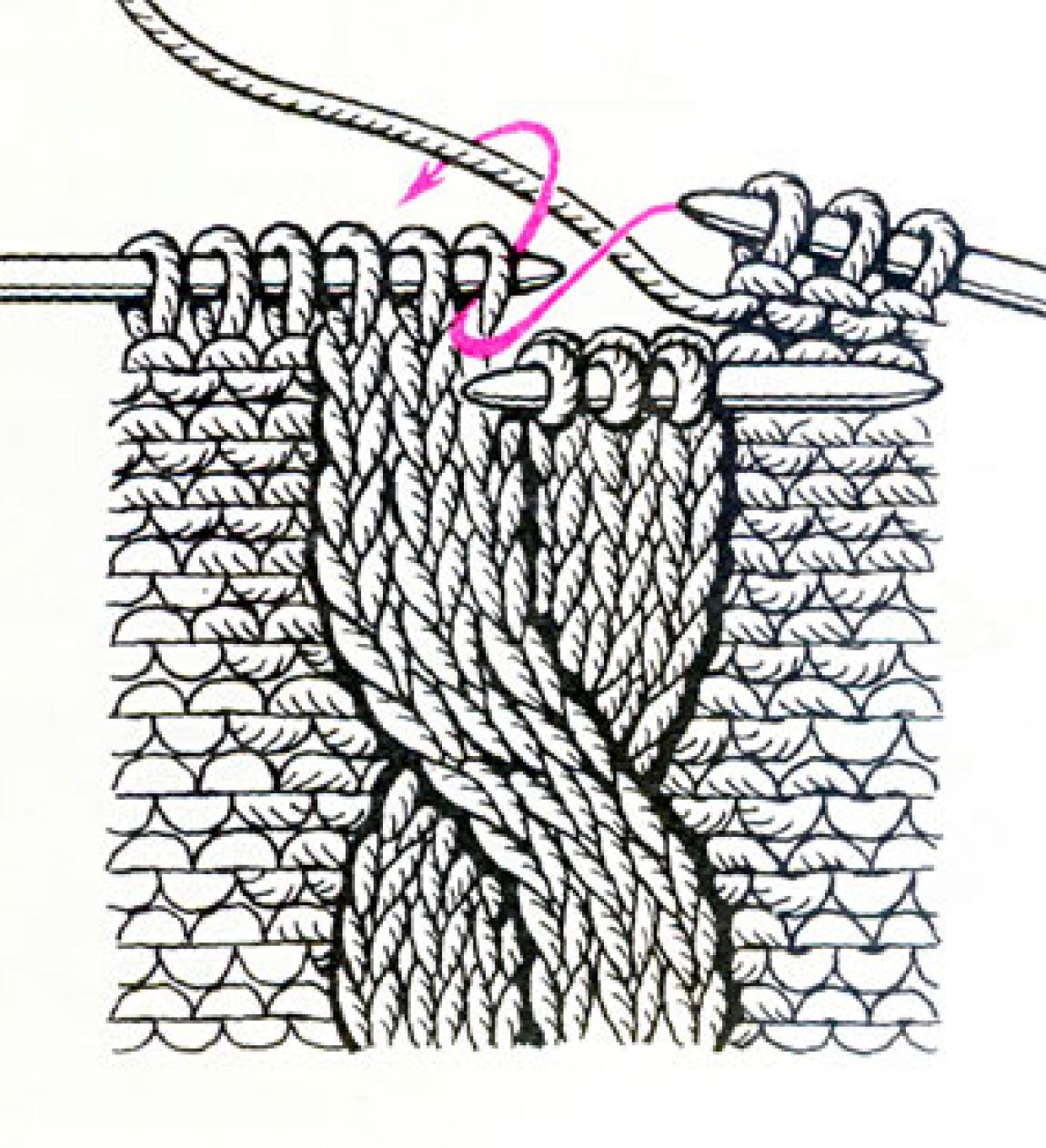 7 й ряд: 7 изн., снять 3 п. на доп. спицу перед работой, 3 лиц.. вязать 3 лиц. с доп. спицы, 7 изн.