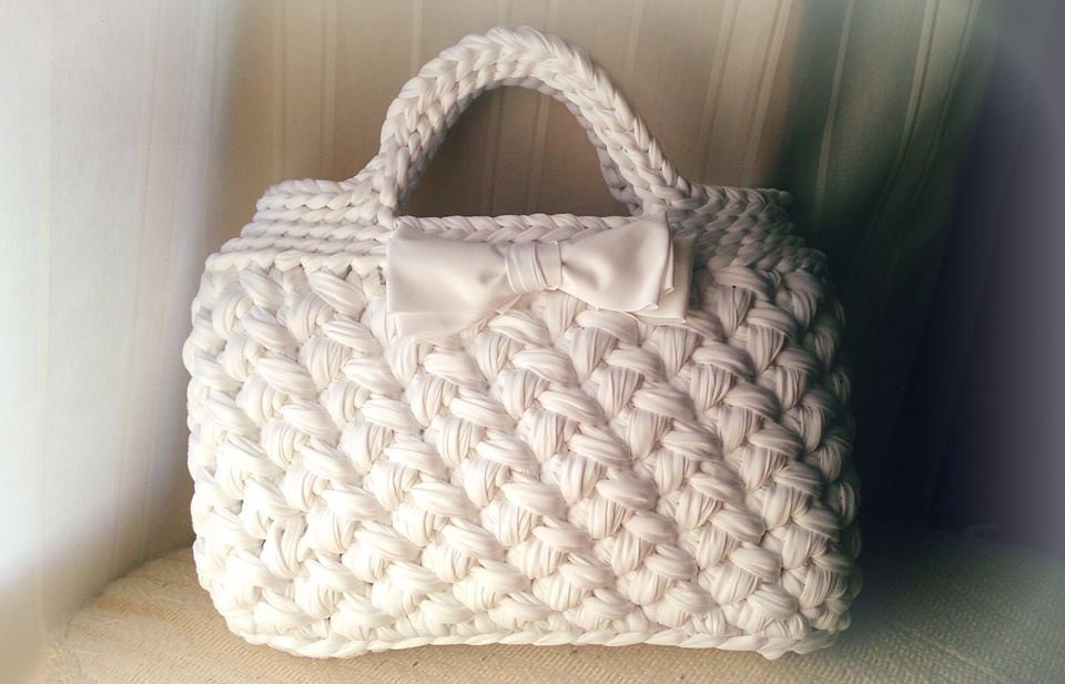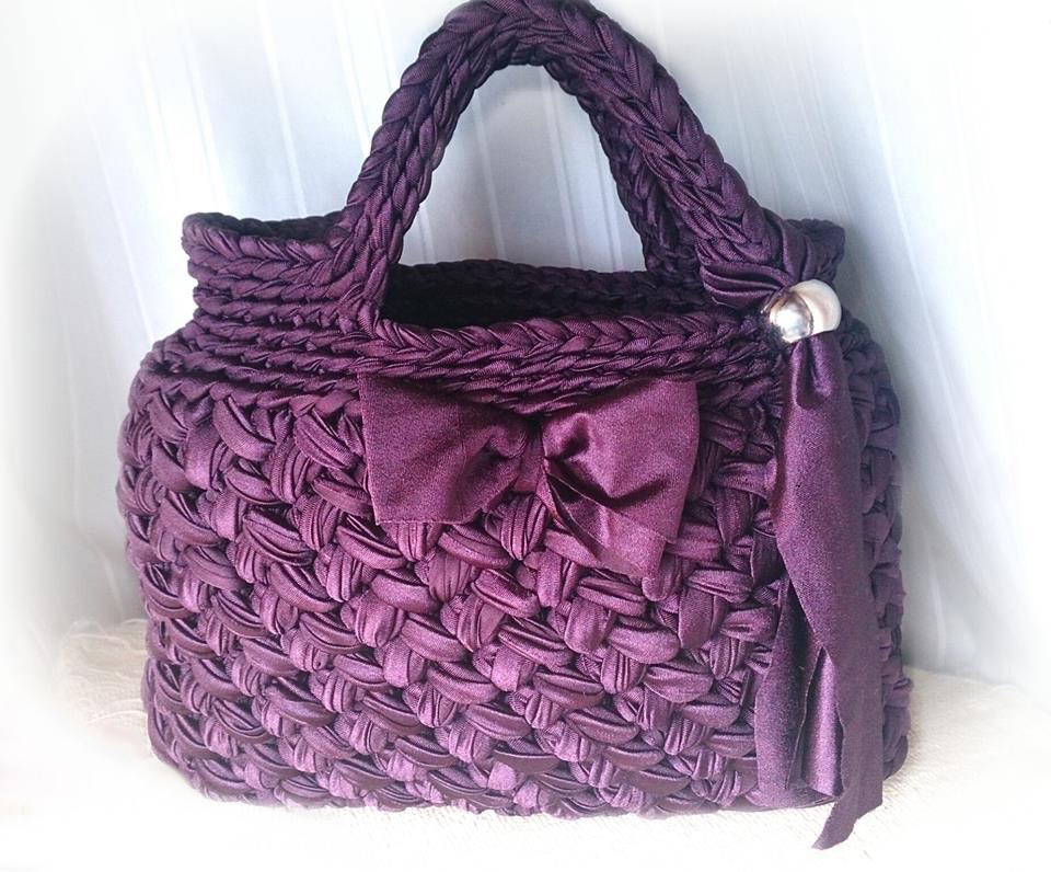 Разнообразные сумки из трикотажной пряжи типа Спагетти или Лента и схема вязания узора. Узор крючком вяжется без поворотных рядов, по кругу. Этим узором можно вязать сумки, клатчи и косметички.