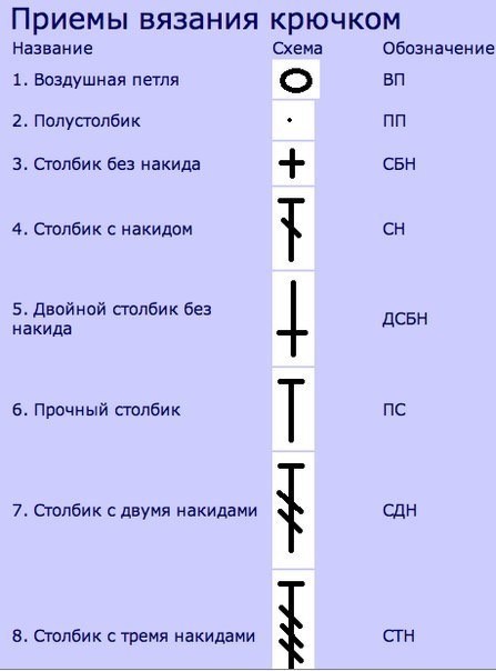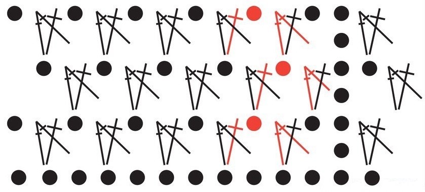 1-й ряд: набрать цепочку ВП нужной длины, замкнуть кольцо. Вяжем 2 ВП подъёма, 1 ВП для узора, пропустить 1 петлю основания и вяжем в следующем СБН. Далее, ввести крючок в получившуюся арку между ВП подъёма и СБН и протягиваем нитку (2 петли на крючке), ввести крючок в основание СБН и снова протянуть нитку (3 петли на крючке). Протягивать основную нить сразу через все 3 петли. Затем узор повторяется.2-й и последующие ряды: СБН провязывается в арку предыдущего ряда.