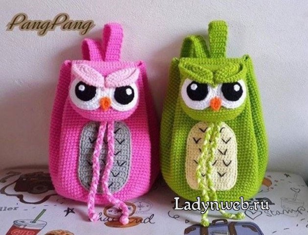 Забавный рюкзак с совами крючкомKlubokhttp://klubok.work/2/62/7533/Klubokhttps://klubok.work/css/image/top-logo-en.pngЗабавный рюкзак с совами крючком Потребуются материалы: * Пряжа розового, светло-розового, серого, белого, черного, оранжевого цветов. (лучше, чтобы пряжа была достаточно толстой.) * крючок по вашу пряжу (скорее всего это будет размер 3-3,5) * игла для сшивания деталей * ножницы начинаем с описания «мешка». Вязжем сам рюкзак: Берем нить розового цвета. Вяжем по кругу снизу вверх. 1р. 6сбн в КА (6) 2р. 6 пр (12) 3р. (сбн, пр) *6 (18) 4р. (2сбн, пр) *6 (24) 5р. (3сбн, пр) *6 (30) 6р. (4сбн, пр) *6 (36) 7р. (5сбн, пр) *6 (42) 8р. (6сбн, пр) *6 (48) 9р. (7 сбн, пр) *6 (54) 10р. (8 сбн, пр) *6 (60) 11р. (9 сбн, пр) *6 (66) 12р. (10 сбн, пр) *6 (72) 13р. (11 сбн, пр) *6 (78) 14р. (12 сбн, пр) *6 (84) 15р. (13 сбн, пр) *6 (90) 16р. (14 сбн, пр) *6 (96) 17-60рр. 96 сбн 61р. (23 сбн, 1ВП, 1 петлю предыдущего ряда пропускаем)*4 (96) Обвязываем 1 рядом «рачьего шага». Вяжем клапан рюкзачка Берем нить розового цвета. Набираем цепочку из 22ВП + 1ВП 1-20рр. 22 сбн, 1 ВП, поворот Нить закрепляем, обрезаем. Пришиваем клапан к мешку рюкзака. Вяжем ремни рюкзака Берем нить розового цвета. Набираем цепочку из 6ВП + 1ВП 1-80рр. 6 сбн, 1ВП, поворот Пришиваем ремни к рюкзаку. Накладка на «брюшко» совы на рюкзаке Берем нить серого цвета. Набираем цепочку из 8ВП + 1ВП 1р. пр ССН, 6 ССН, пр ССН (10), 1ВП, поворот 2-11рр. 10ССН (10), 1ВП, поворот 12р. уб ССН, 6 ССН, уб ССН (8) Обвязываем деталь со всех сторон 1 рядом сбн. Нить обрезаем и закрепляем. Пришиваем накладку к рюкзаку как показано на рисунке. Вышиваем на «брюшке» узор «перышки» нитью черного цвета. Голова совы Нить розового цвета. Набираем цепочку из 10ВП+1ВП. 1р. Вяжем с обеих сторон цепочки по кругу (итого изначально у нас имеется 20 петель). (сбн, пр)*10 (30) 2р. (2 сбн, пр) *10 (40) 3-16рр. 40 сбн (40) 17р. (2 сбн, уб) *10 (30) 18р. (сбн, уб) *10 (20) Деталь слегка набиваем. Складываем пополам, вяжем 10 сбн, захватывая по 2 петли спереди и сзади. Вяжем веки совы (2 детали) Берем нить светло-розового цвета. 1р. 6 сбн в КА (6) 2р. 6 пр (12) 3р. (сбн, пр) *6 (18) 4р. (2 сбн, пр) *6 (24) 5р. (3 сбн, пр) *6 (30) Вяжем глаза (2 детали). Белки глаз — берем нить белого цвета. 1р. 6 сбн в КА (6) 2р. 6 пр (12) 3р. (сбн, пр) *6 (18) 4р. (2 сбн, пр) *6 (24) 5р. (3 сбн, пр) *6 (30) Вяжем зрачок Берем нить черного цвета. 1р. 6 сбн в КА (6) 2р. 6 пр (12) 3р. (сбн, пр) *6 (18) Вяжем блики для глаз Берем нить белого цвета. 1р. 6 сбн в КА (6) Детали накладываем друг на друга как вам больше нравится, пришиваем. Сверху на глаза пришиваем веки как показано на рисунке. Пришиваем глаза с веками к голове совы. Вяжем клюв Берем нить оранжевого цвета. 1р. 6 сбн в КА (6) 2р. 6 пр (12) Складываем клюв пополам и провязываем, захватывая по 2 петли (для переда и зада) 6 сбн. Пришиваем клюв к голове, разместив его между глазами. Готовую голову совы пришиваем к клапану рюкзака. Из розовой, светло-розовой и белой пряжи плетем шнур-косу необходимой длины, продеваем шнур через отверстия в рюкзаке, образованные в 61 ряду. Слегка стягиваем, завязываем.