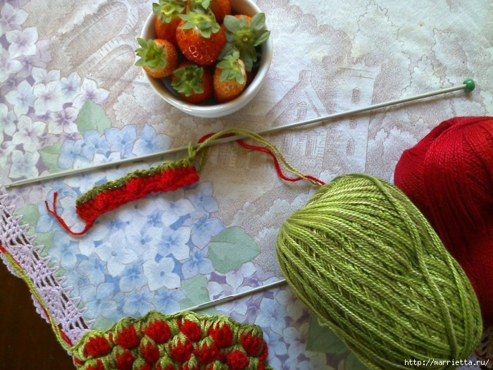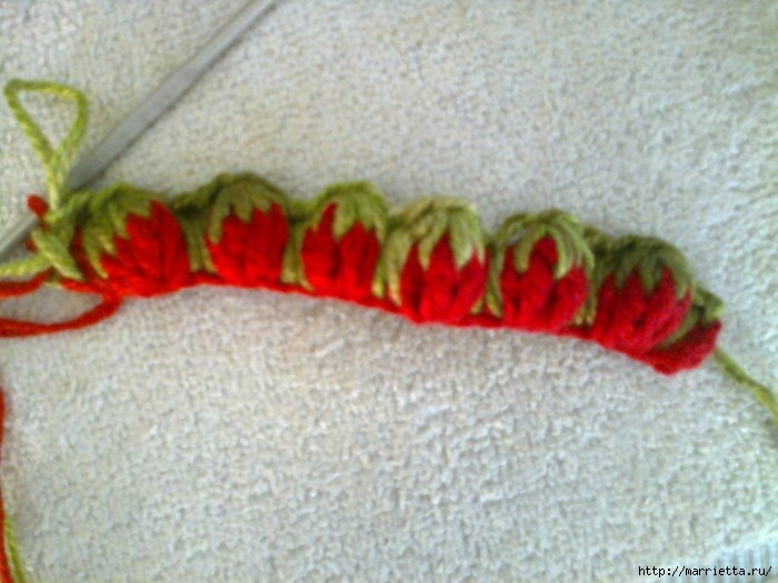 1 ряд - это воздушные петли кр. нитью(кратно 4 +2), 2 ряд - (зел. нить) 3 возд п. для подъема 2 ст. с нак. * (кр. нить)4 ст. с двумя нак., (зел). 3 ст. с нак.* (все нити проводить перед вязанием. 3 ряд - (зел) 1 в.п. *4 полуст без накида вязать между кр ст. предыд ряда, потом их закончить. провязав вместе, 3 ст. без нак.* 4 ряд - (кр. нить) 3 возд.п. для подъема, 1 ст. с нак. а дальше как 2 ряд от * до*красной нитью придется вязать с двух мотков. Лицевые ряды нечетные.