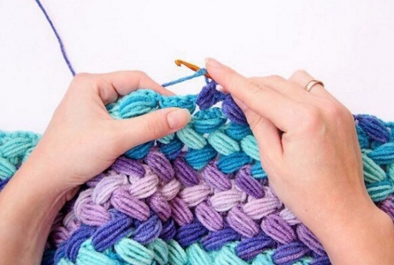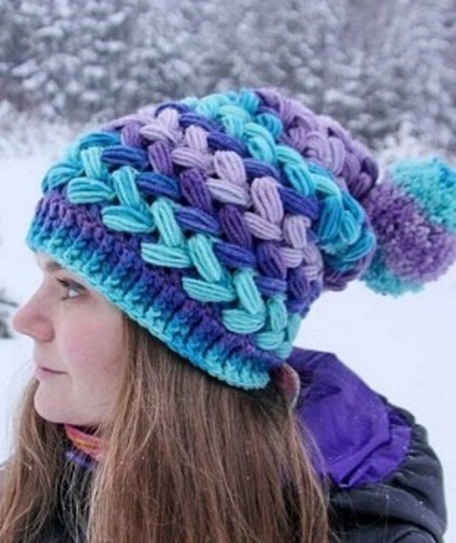 Крупный объемный узор для вязания шапки крючком. Освоить этот узор совсем не сложно. В моду давно и прочно вошли объемные шапки. В них тепло и комфортно, и они гармонично смотрятся с верхней одеждой. Эта шапочка связана из пряжи нескольких цветов холодных оттенков: голубой, фиолетовой, синей и сиреневой. Шапка заканчивается разноцветным помпоном. Для вязания шапки вам потребуется крючок №3,5. Большой расход пряжи для шапочки, компенсируется тем что изделие получается очень теплым. Если укрепить шапку подкладом, то её можно носить даже зимой.
