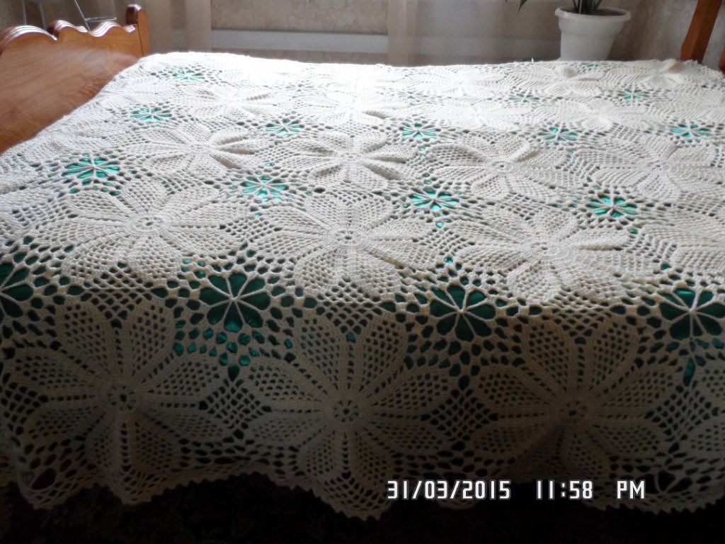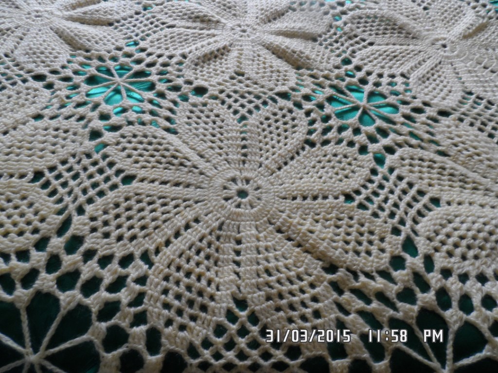 5в.п, 3 п с 1нак, 5в.п., 3п.с1нак, 15в.п, 3п.с 1нак, 5в.п, 3п.с 1нак, 5в.п, потом делаем 2соед.петли и делаем вершинку следующего лепестка4п с 1нак, пото5 арочек из в.п. и т. д.
