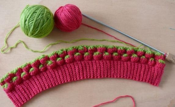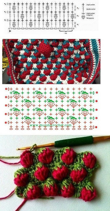 2 ряд — (зел. нить) 3 возд п. для подъема 2 ст. с нак. * (кр. нить)4 ст. с двумя нак., (зел). 3 ст. с нак.* (все нити проводить перед вязанием.