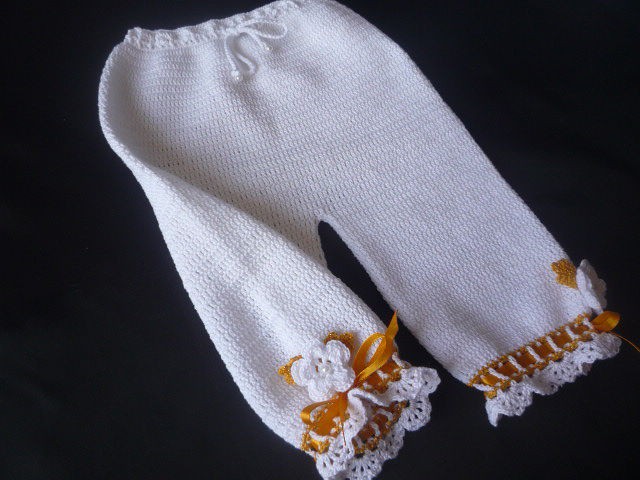 Брючки вязала без схемы,вязала сверху вниз.Набирала нужное количество пителек(по обхвату бёдер) вязала до нужной длины,а потом делила на две равные части(штанины)и вязала уже каждую часть отдельно по кругу.