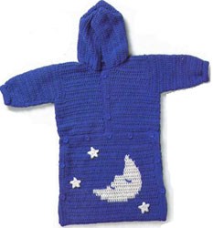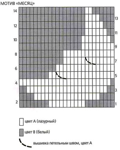 Крючком 3,5 мм связать цепочку из 5 в.п. пряжей цвета В и соединить ее в кольцо 1 соед. ст. в первую в.п. Круговой ряд 1: * 3 в.п., 1 ст. б/н во вторую в.п. от крючка, 1 полуст. в следующую в.п., 1 соед. ст. в следующую в.п. кольца, повторить от * еще 4 раза, закончить последним соед. ст. в основание первой п. звездочки. Закрепить. Расположить звездочки на клапане, как показано на фотографии, и пришить. Руководствуясь схемой, вышить петельным швом глаз и рот Месяца (цвет А). Отпарить, как указано в инструкции к пряже.