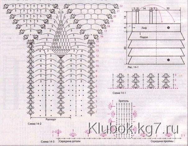 Second stage (skirt). From the bottom edge of the bodice, start crocheting the skirt from top to bottom. Crochet in the round without seams using the pattern from diagram 14-2. How to start is indicated in diagram 14-1. First, crochet the main fabric with frill (from the 1st to the 7th rows, crochet the 8th row 9 times, from the 9th to the 10th rows, crochet the 11th row 20 times according to diagram 14-2). Finish the work on the fragment by crocheting the frill (from the 12th to the 22nd rows of diagram 14-2). Now proceed to crochet 3 more frills. They are crocheted using the pattern from diagram 14-2 (from rows 1.1 to 22). Start crocheting the frills on the front side of the skirt fabric on the 5th, 16th, and 27th rows. After crocheting all the frills, finish the work on the skirt.