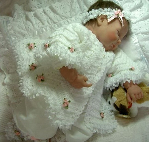 По-моему здесь больше сложностей будет при украшении платья. Сейчас на рынке предлагают массу кружев. Именно из тоненького присобранного кружева выполнено украшение для головы малышки и обшито само платьице. Также для декорирования использованы маленькие розы с листьями, которые тоже можно купить или же выполнить из атласной ленты.