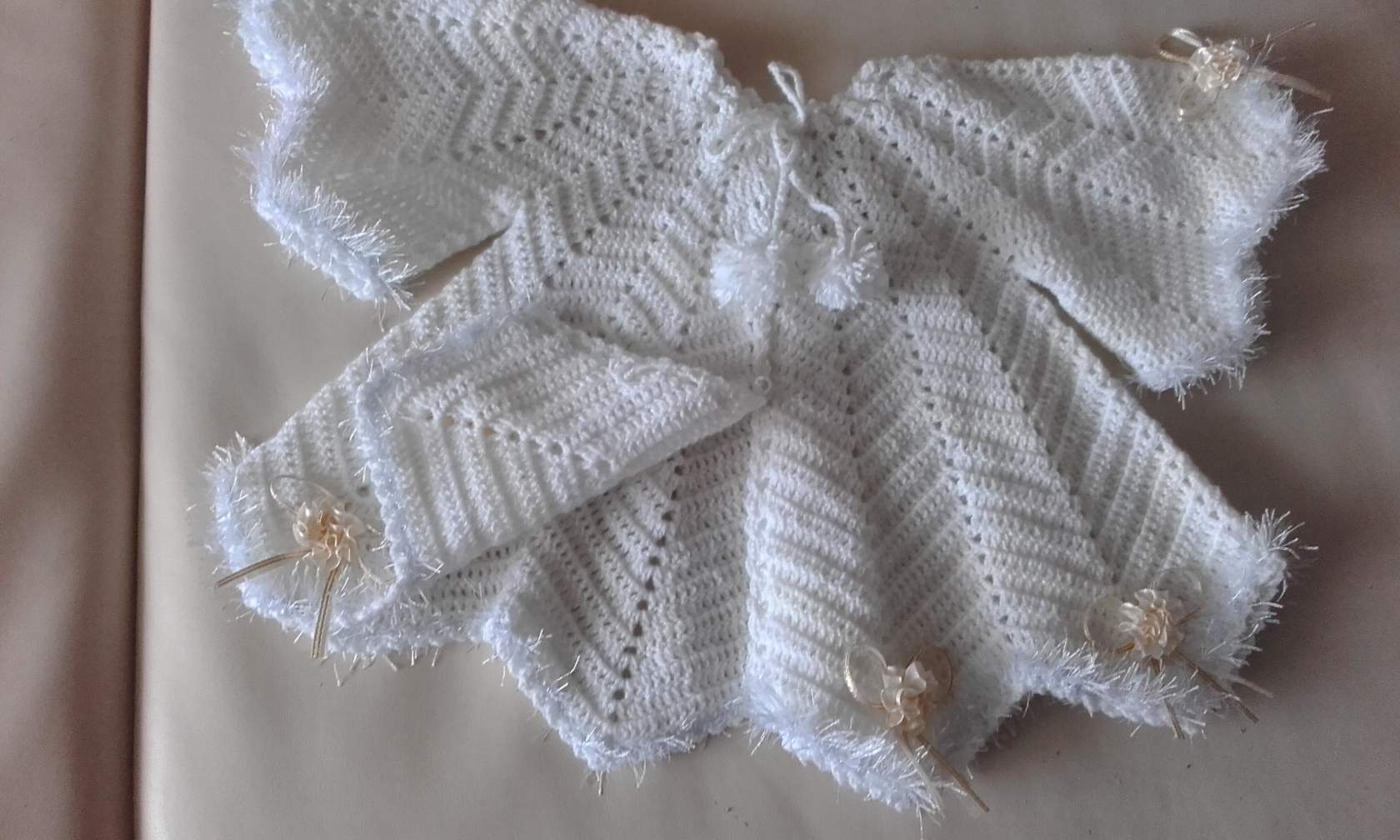 Для пуговиц используйте миниатюрные белые или перламутровые пуговички. Их понадобиться 3-4 штуки. Петелькой для них послужит арка из воздушных петель.