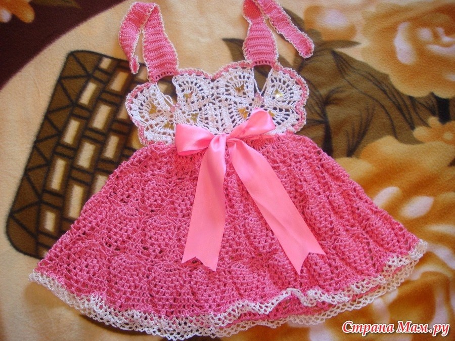 Crochet dress for a girlKlubokhttp://klubok.work/22/175/5118/Klubokhttps://klubok.work/css/image/top-logo-en.pngIn this work, we use pink and white threads. You can choose the thread colors to your taste and desire. The ribbon should match the color of the dress.