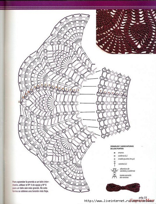Набрала по схеме 124 воздушные петли. Ряды чередуются ССН и СБН. Первый ряд вяжется ССН. Вяжу строго по схеме, здесь уже связала 5 рядовПровязала 14 рядов и в 15 ряду провязала проймы. Окружность груди малышки 47 см, я прибавила еще 5 см, получилась кокетка с окружностью 52 смСкажу сразу, что надо просчитывать количество петель, чтобы получился раппопорт. Один раппопорт у нас получается 8 петель. После моих провязаных 14 рядов у меня стало 138 петель, на проймы я добавила 22 петли (по 11 петель на каждую пройму).В итоге у меня получилось 160 петель - 20 раппопортов. Дальше я соединила свою кокетку в круг и начала вязать по кругу, но поворотными рядами, чтобы было покрасивее