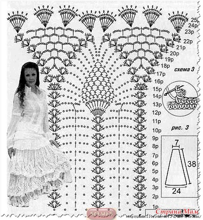 По схеме юбки между галочками из ССН идут сначала три ряда по одной ВП, потом три ряда по две ВП, потом по три ВП, потом по четыре ВП.