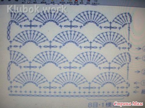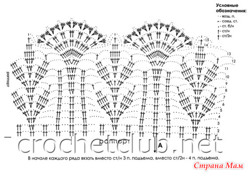 Затем сверху вниз вязала подол по такой схеме (кроме последнего 22-го ряда), только прибавляла побольше столбиков и возд. петель, чтобы получить нужную длину: