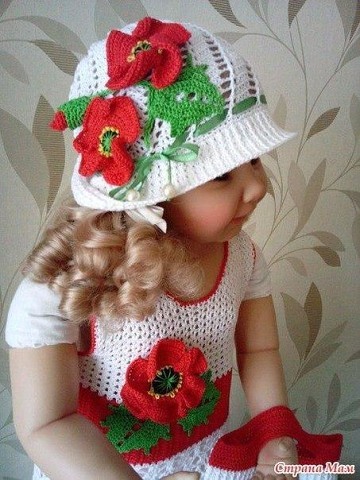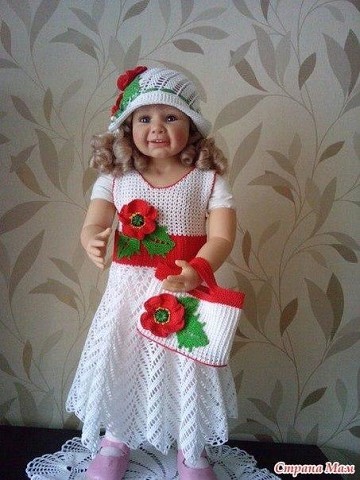 (100% мерсеризированный хлопок, 220/50) крючками 1.8 и 2. точное кол-во мотков сказать не смогу, приблизительно 3 - 4 белых и 1 с небольшим красных. На украшения использовала ниточки Coco - зеленые и желтые, немного черного Нарцисса. Комплект приблизительно на рост 80-98 см. На фото кукла 80 см, В комплект входит #платье, #шляпка и #сумочка. Юбка в платье - солнце, так что вполне можно при желании, сделать подюбник из красной органзы.