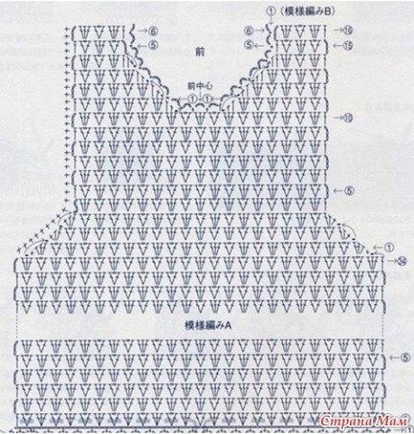 2)Далее с одной стороны пояса вверх вяжем кокетку. Можно связать вот такую кокетку: 3