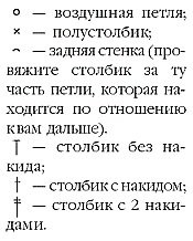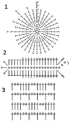 3 р. - 3 в.п. подъема, 2 с. н. под дугу предыдущего ряда, 1 с.н. в столбик предыдущего ряда, 2 в.п., 1 с.н. в тот же столбик предыдущего ряда, 2 с.н. в следующую дугу предыдущего ряда, 1 с. н. в столбик предыдущего ряда, 2 в. п. и так до конца ряда;