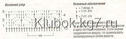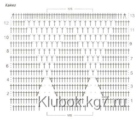 1-й ряд: * 1 столбик с накидом, 2 воздушные петли, повторять от *, закончить 1 столбиком с накидом