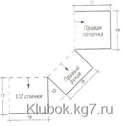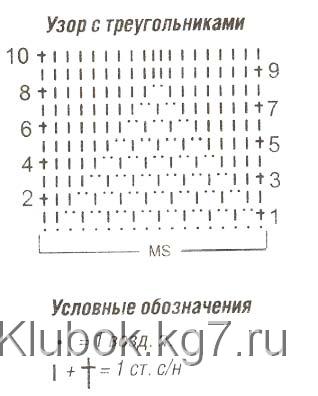 Связать цепочку из 54 воздушных петель плюс 2 петли подъема и вязать узором с треугольниками. Затем продолжить работу основным узором. Для боковых скосов прибавить с обеих сторон, начиная от наборного края в каждом 2-м ряду 2 раза по2 петли и в каждом ряду 5 раз по 1 петле, включая прибавляемые петли в узор (= 71 петля). Через 13 см от наборного края оставить с правой стороны для шлицы 1 раз 3 петли. Через 35 см от наборного края оставить для проймы петли с 29-й по 37-ю и обе стороны закончить раздельно. Со стороны спинки оставить для проймы в каждом ряду еще 1 раз три петли и 1 раз две петли. Через 44 см от наборного края оставить с левой стороны для выреза горловины спинки 12 петель. Через 45 см от наборного края оставить петли плеча и закончить работу. Со стороны переда выполнить убавления, как на спинке. Через 41 см от наборного края оставить для выреза горловины 1 раз 4 петли и далее в каждом ряду 1 раз три и два раза по 1 петле. Через 45 см от наборного края закончить работу.
