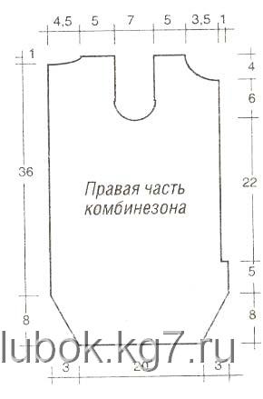 Сборка: выполнить плечевые швы и швы штанин, а также шов середины спинки. Вертикальные края шлицы обвязать 6-ю рядами столбиков без накида, при этом на произвольно выбранной планке равномерно выполнить 6 отверстий для пуговиц. Остальные края комбинезона обвязать узором для планок. Пришить пуговицы.