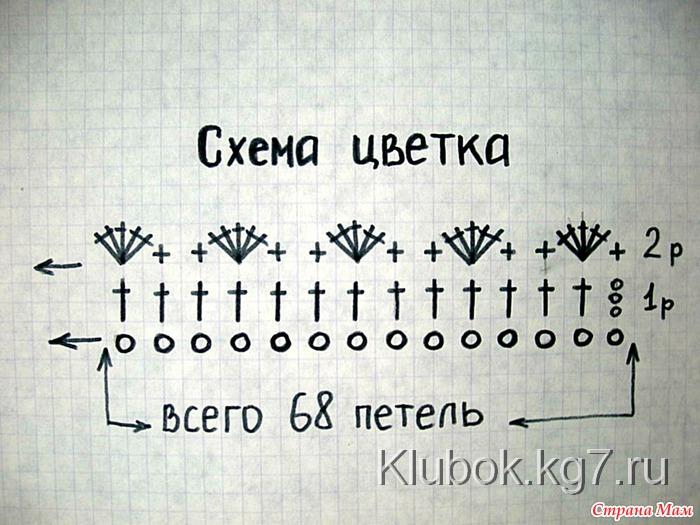 Основной узор по 1 схеме, рюши по 2 схеме, я набирала 210 петель, вязала снизу вверх, потом внизу надвязывала рюши. Поля панамки вязала по второй схеме, только в веерочке добавила 1 лепесток, иначе поля будут практически одной ширины с панамкой."
