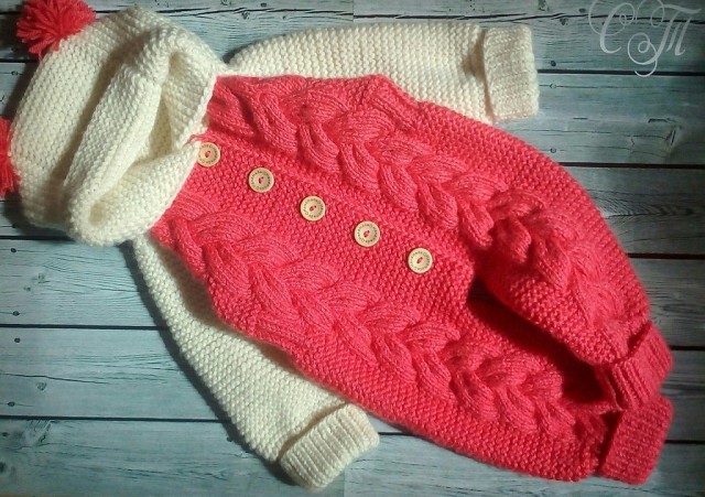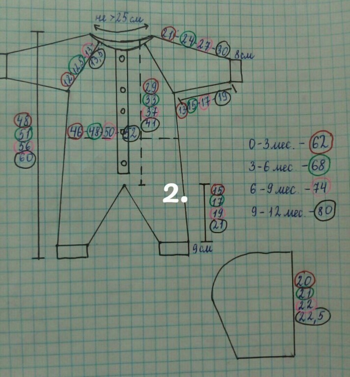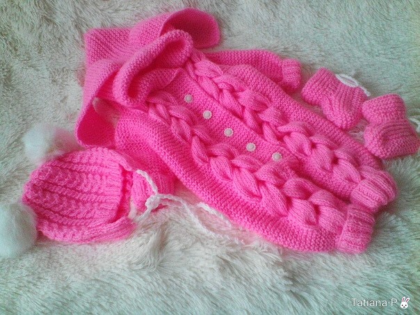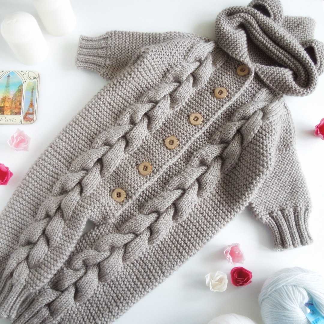 Комбинезон с косами.Klubokhttp://klubok.work/23/181/7515/Klubokhttps://klubok.work/css/image/top-logo-en.pngСвязан из детской пряжи BAMBINO от ООО "КАМТЕКС" (35% меринос, 65% акрил), 150 м/50 г Вязание в 2 нити Пришивной реглан До начала вязания изучила огромное количество схем и на их основе составила свою. При вязании можно использовать её, либо опираться на размеры малыша - фото 2 ИСПОЛЬЗУЕМЫЕ УЗОРЫ - резинка 1/1 - резинка 2/2 - платочная вязка - узор "сложная коса" - фото 3 Начала вязание со штанин. Манжеты вязала вкруговую резинкой 1/1 спицами меньшего размера. Высота манжеты - 9 см. Перешла на основной узор. Спицы # 4. Связав одну штанину на нужную высоту, отложила её. Вторая штанина вяжется в зеркальном отражении - фото 4 Соединила детали, добавляя петли по схеме - фото 5. Ластовицу не вывязывала, добавила петли для расширения. Прибавления обозначены точками на схеме. Далее вязала по узору до подмышек. На одной из планок делала отверстия для пуговиц - фото 6 В районе поясницы вместо платочной вязки пустила резинку 2/2 между кос - фото 7 Рукава. Манжеты вязала спицами меньшего размера резинкой 1/1 вкруговую. Основное полотно - платочная вязка. Достигнув необходимой высоты, отложила на маркеры петли подрезов и начала вязать реглан. Убавления в каждом лицевом ряду - фото 8. Оба рукава вяжутся одинаково. Разделила петли основного полотна на части - полочка, спинка, полочка. При этом нужно учитывать, что "коса" стягивает полотно. Отложила на маркеры петли для подрезов. Каждую часть вязала отдельно, делая убавления в лицевых рядах. Сборка деталей. Объединяем все детали на одних спицах по схеме - полочка, рукав, спинка, рукав, полочка. В первом ряду сделала убавления для линии горлышка на уровне рукавов и спинки. Провязала ещё ряд. Капюшон. Добавила петли для расширения, согласно схеме. Вязала прямо платочной вязкой до нужной высоты -фото 9. Петли закрыла используя среднюю часть - фото 10 Сшила реглан, подрезы. Выполнила швы по рукавам и штанинам. Спрятала все "хвостики" пряжи. Пришила пуговицы. Сделала бомбошечки и прикрепила на капюшон. ВТО согласно рекомендациям на этикетке от пряжи.