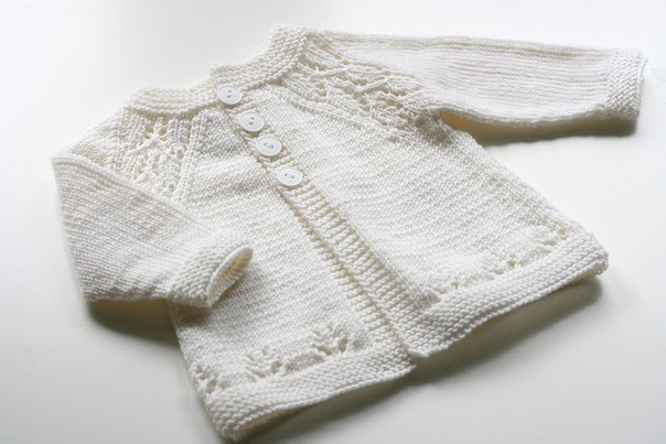 Кофточка-жакетик для самых маленьких связана спицами, украшена ажурными рисунками по низу изделия, напоминающими цветочки, а по регланным линиям — узор из листиков. Модель подходит как девочкам, так и мальчикам, в зависимости от выбранного цвета пряжи и пуговок.