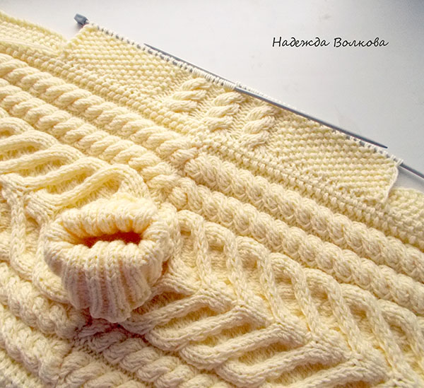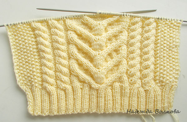 6-st rc: 3 п. оставить на вспом. спице за работой, 3 лиц., затем провязать лицевыми 3 п. со вспом. спицы