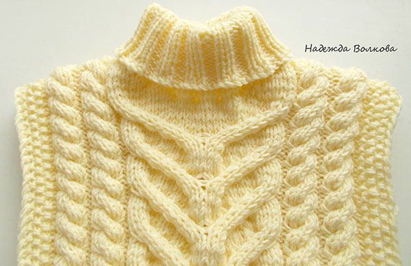 Т. о у нас получилось, что на плечах петли закрытые, а петли горловины открыты. Одеваю их на спицу 3,5 и вяжу резинкой 2*2 примерно 12 см, закрываю ворот. Можно вязать на круговых спицах , чтоб было без шва.