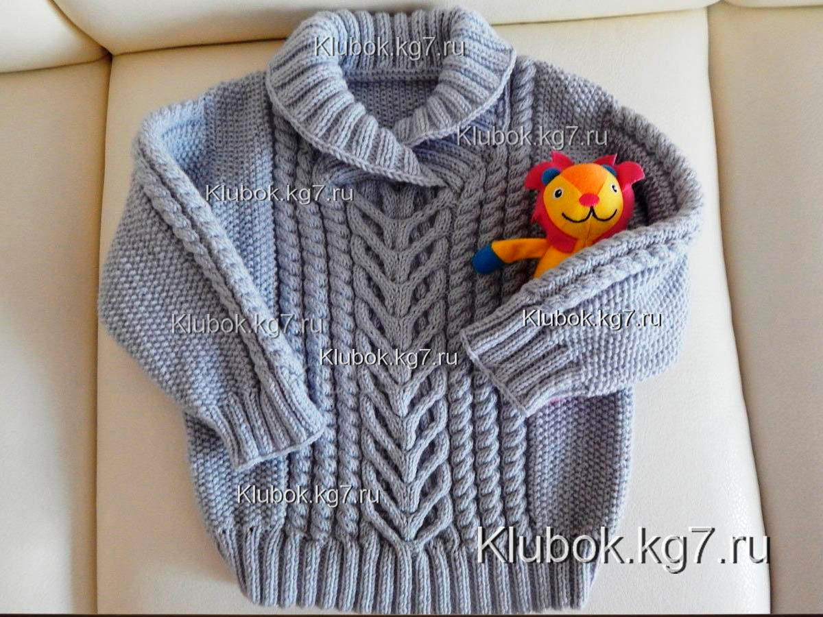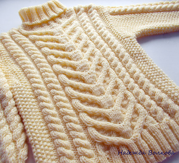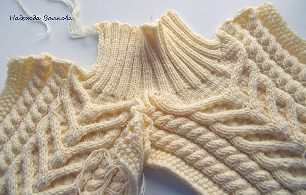 Перед вяжу аналогично спинке до высоты 40 см. Начинаю формировать вырез горловины, для этого вяжу укороченными (поворотными) рядами: провязываю соблюдая рисунок 32 петели, поворачиваю, делаю накид, вяжу в обратную сторону 32 п соблюдая рисунок, вяжу 30 п, поворачиваю, накид, 30 п, вяжу 28 п, поворачиваю накид, 28 п, вяжу 27 п, поворачиваю, накид, 27 п, вяжу 26 п, поворачиваю накид, 26 п,вяжу 25 п, поворачиваю, накид, 25 п, вяжу 25 п, поворачиваю накид, 19 п (начинаем скос плеча), поворот, накид, 18 п, поворот, накид, 7 п, поворот, накид, 7 п, поворот, накид, провязываю петли плеча до конца, при этом накиды вяжу вместе с соседней петлей, закрываю плечо, провязываю оставшиеся петли до конца ряда, не забывая накид вместе со след . петлей вязать. Вторую половину провязываю аналогично.