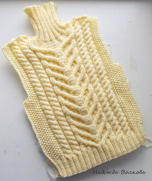 Вязать перед до высоты спинки, с изнаночной стороны сделать искоси для плечей (как для спинки), сделать плечевые швы, одновременно закрывая петли с плечей спинки и переда. Длинна плеча 10 (12,5) см.