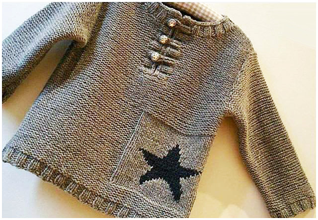 Вам потребуется: пряжа (50% шерсти, 30% полиакрила, 20% вискозы; 90 м/50 г) — 450 г коричневой меланжевой; спицы № 3,5— 4,5 и 4,5—5,5; 3 серебряные пуговицы диаметром 1,5 см. Резинка: попеременно 2 лицевые, 2 изнаночные. Лицевая гладь: лицевые ряды — лицевые петли, изнаночные ряды — изнаночные петли. Изнаночная гладь: лицевые ряды — изнаночные петли, изнаночные ряды — лицевые петли. Плотность вязания: полосы лицевой и изнаночной глади, спицы № 4,5—5,5: 18 п. х 24 р. = 10 х 10 см; лицевая гладь: 16 п. х 22 р. = 10*10 см. Спинка: Набрать 70 п. на спицы № 3,5—4,5 и вязать 4 см резинкой. Продолжить работу спицами № 4,5—5,5: кром., изнаночная гладь, кром. Через 43 см = 102 р. от резинки петли закрыть. Перед: вязать, как спинку, но через 24 см = 58 р. от резинки для застежки закрыть средние 4 п. и обе стороны закончить раздельно. Через 12 см = 28 р. от начала раздельного вязания закрыть с внутреннего края для горловины 1 раз 4 п., затем в каждом 2-м р. 1 раз 3 п., 1 раз 2 п. и 3 раза по 1 п. Через 47 см от нижнего края детали закрыть все петли. Рукава: набрать 38 п. на спицы № 3,5—4,5 и вязать 4 см резинкой. Продолжить работу спицами № 4,5—5,5: кром., изн. глади, кром. Для скосов прибавить с обеих сторон 15 раз по 1 п. в каждом 4-м р.. Через 33 см от нижнего края детали закрыть все петли. Сборка: Детали наколоть на выкройку, увлажнить и оставить до высыхания. Выполнить плечевые швы. Вшить рукава. Выполнить швы рукавов и боковые швы. Для бейки набрать на спицы № 3,5— 4,5 по краям горловины переда по 18 п., по краю горловины спинки 24 п. и вязать 3 см резинкой, затем петли закрыть. По вертикальным краям разреза набрать по 32 п. и вязать резинкой При ширине планок 1,5см все петли закрыть. Планки по коротким сторонам пришить к переду на участке с закрытыми петлями. Пришить пуговицы. #СпицамиДетскаяКофточка
