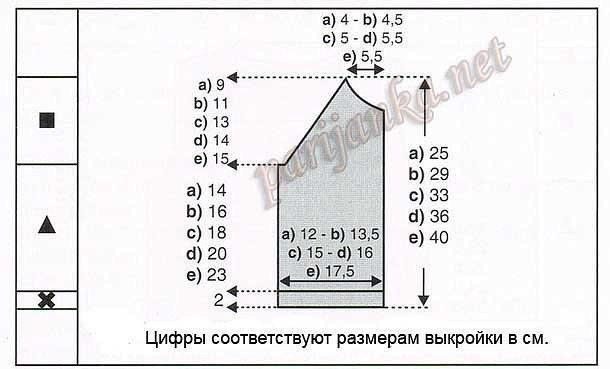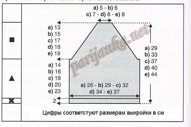 КАРДИГАН ДЛЯ ДЕВОЧКИ РАЗМЕРЫ а) 2 года - b) 4 года - c) 6 лет - d) 8 лет - e) 10 лет ПРЯЖА (кол-во мотков) НАЗВАНИЕ ЦВЕТ 2 года 4 года 6 лет 8 лет 10 лет PHIL ECOLO DAUPHIN 4 5 6 6 7 Длина и состав пряжи: 100 % полиэстер, 50г = 96 м. Спицы 3 и 3,5 мм Дополнительно: маркеры петель, 1 кнопка диаметром 13 мм. УЗОРЫ • Резинка 2/2 • Платочная вязка • Фантазийный узор «Соты»: Число петель кратно 2 + 1 + 1 кромочная п. с каждой стороны. 1й ряд (изн. сторона): лицевые петли. 2й ряд: 1 кром., * 1 лиц. из нижнего ряда (= ввести спицу в петлю на 1 ряд ниже и провязать ее лицевой, при этом распустив петлю предыдущего ряда), 1 лиц.*, повторять от * до *, закончить 1 лиц. петлей из нижнего ряда, 1 кром. 3й ряд: лицевые петли. 4й ряд: 1 кром., *1 лиц., 1 лиц. из нижнего ряда*, повторять от * до *, закончить 1 лиц., 1 кром. В высоту повторять эти 4 ряда. ПЛОТНОСТЬ: 10х10 см = 19 п. и 44 ряда узором «Соты», спицы 3,5 мм. 20х10 см = 43 п. на 42 ряда платочным узором, спицы 3,5 мм. СПИНКА х → Набрать a) 62 п. - b) 70 п. - c) 74 п. - d) 82 п. e) 86 п. на спицы 3 мм и вязать 2 см (=7 рядов) резинкой 2/2, начиная и заканчивая 1-й и все лицевые ряды с a) b) e) 2 изн. п., c) d) 2 лиц. п. ? → Перейти на спицы 3,5 мм и вязать фантазийным узором, равномерно убавив в первом ряду a) c) 11 п. - b) e) 13 п. - d) 15п. Остается a) 51 п. - b) 57 п. - c) 63 п. - d) 67 п. - e) 73 п. На высоте a) 13 см (57 рядов) d) 19 см (83 ряда) b) 15 см (67 рядов) e) 22 см (97 рядов) c) 17 см (75 рядов) от резинки связать 1 изнаночный ряд лицевыми петлями и далее вязать платочной вязкой спицами 3,5 мм равномерно прибавив в первом ряду a) 6 п. - b) c) d) e) 8 п. Должно получиться a) 57 п. - b) 65 п. - c) 71 п. - d) 75 п. - e) 81 п. ? → На высоте a)14 см d)20 см b)16 см e)23 см c)18 см от резинки для регланных скосов с каждой стороны закрыть: 1 x 2п., затем убавить: a) 8 x 1 п. в каждом 2-м ряду, * в каждом 4-м ряду: 1 x 1 п. и в каждом 2-м ряду: 1 x 1 п.*, повторить от * до * 6 раз. b) 7 x 1 п. в каждом 2-м ряду, *в каждом 4-м ряду: 1 x 1 п. и в каждом 2-м ряду: 1 x 1 п.*, повторить от * до * 8 раз. c) 5 x 1 п. в каждом 2-м ряду, * в каждом 4-м ряду: 1 x 1 п. и в каждом 2-м ряду: 1 x 1 п.*, повторить от * до * 10 раз. d) 4 x 1 п. в каждом 2-м ряду, * в каждом 4-м ряду: 1 x 1 п. и в каждом 2-м ряду: 1 x 1 п.*, повторить от * до * 11 раз. e) 9 x 1 п. в каждом 2-м ряду, ** в каждом 4-м ряду: 1 x 1 п. и в каждом 2-м ряду: 1 x 1 п.*, повторить от * до * 10 раз. На высоте a) 27 см d)38 см b)31 см e)42 см c)35 см от резинки закрыть оставшиеся a) 13 п. - b) 15 п. -c) 17 п. - d) 19 п. - e) 19 п. ЛЕВАЯ ПОЛОЧКА х → Набрать a) 29 п. - b) 33 п. - c) 35 п. - d) 39 п. - e) 41 п. на спицы 3 мм и вязать 2 см (=7 рядов) резинкой 2/2, начиная в 1-м и всех лицевых рядах с 3-х лиц. петель и заканчивая a) b) e) 2 изн. п. - c) d) 2 лиц. п. ? → Перейти на спицы 3,5 мм и вязать фантазийным узором «Соты», равномерно убавив в 1-м ряду a) c) 4 п. - b) d) e) 6 п. Остается a) 25 п. - b) 27 п. - c) 31 п. - d) 33 п. - e) 35 п. На высоте a) 13 см (57 рядов) d) 19 см (83 ряда) b) 15 см (67 рядов) e) 22 см (97 рядов) c) 17 см (75 рядов) от резинки связать 1 изнаночный ряд лицевыми петлями и далее вязать платочной вязкой спицами 3,5 мм равномерно прибавив в первом ряду a) 2 п. - b) e) 4 п. - c) d) 3 п. Получается a) 27 п. - b) 31 п. - c) 34 п. - d) 36 п. -e) 39 п. ? → На высоте a)14 см d)20 см b)16 см e)23 см c)18 см от резинки для регланных скосов закрыть с правой стороны 2 п., а затем убавить: a) 8 x 1 п. в каждом 2-м ряду, * в каждом 4-м ряду: 1 x 1 п. и в каждом 2-м ряду: 1 x 1 п.*, повторить от * до * 3 раза. b) 7 x 1 п. в каждом 2-м ряду, *в каждом 4-м ряду: 1 x 1 п. и в каждом 2-м ряду: 1 x 1 п.*, повторить от * до * 5 раз. c) 5 x 1 п. в каждом 2-м ряду, * в каждом 4-м ряду: 1 x 1 п. и в каждом 2-м ряду: 1 x 1 п.*, повторить от * до * 7 раз. d) 4 x 1 п. в каждом 2-м ряду, * в каждом 4-м ряду: 1 x 1 п. и в каждом 2-м ряду: 1 x 1 п.*, повторить от * до * 8 раз. 