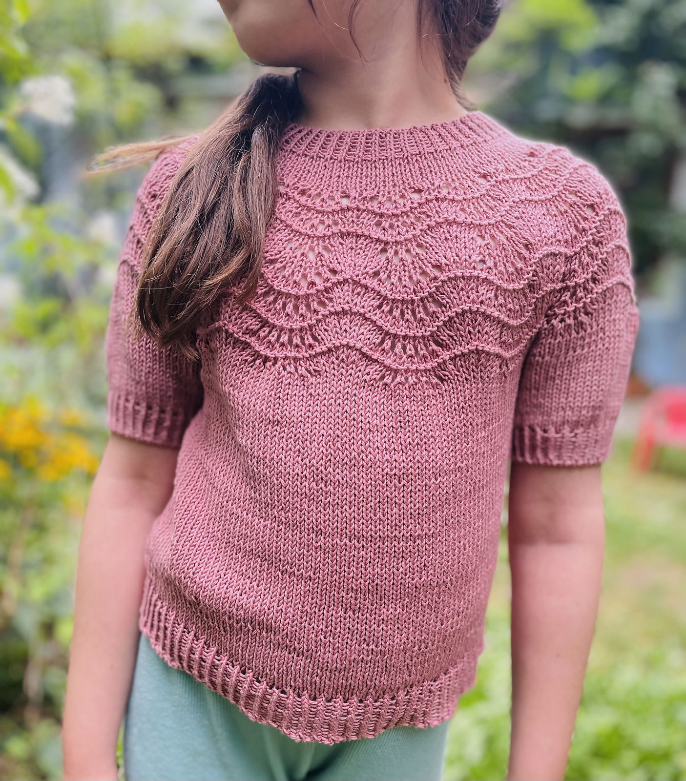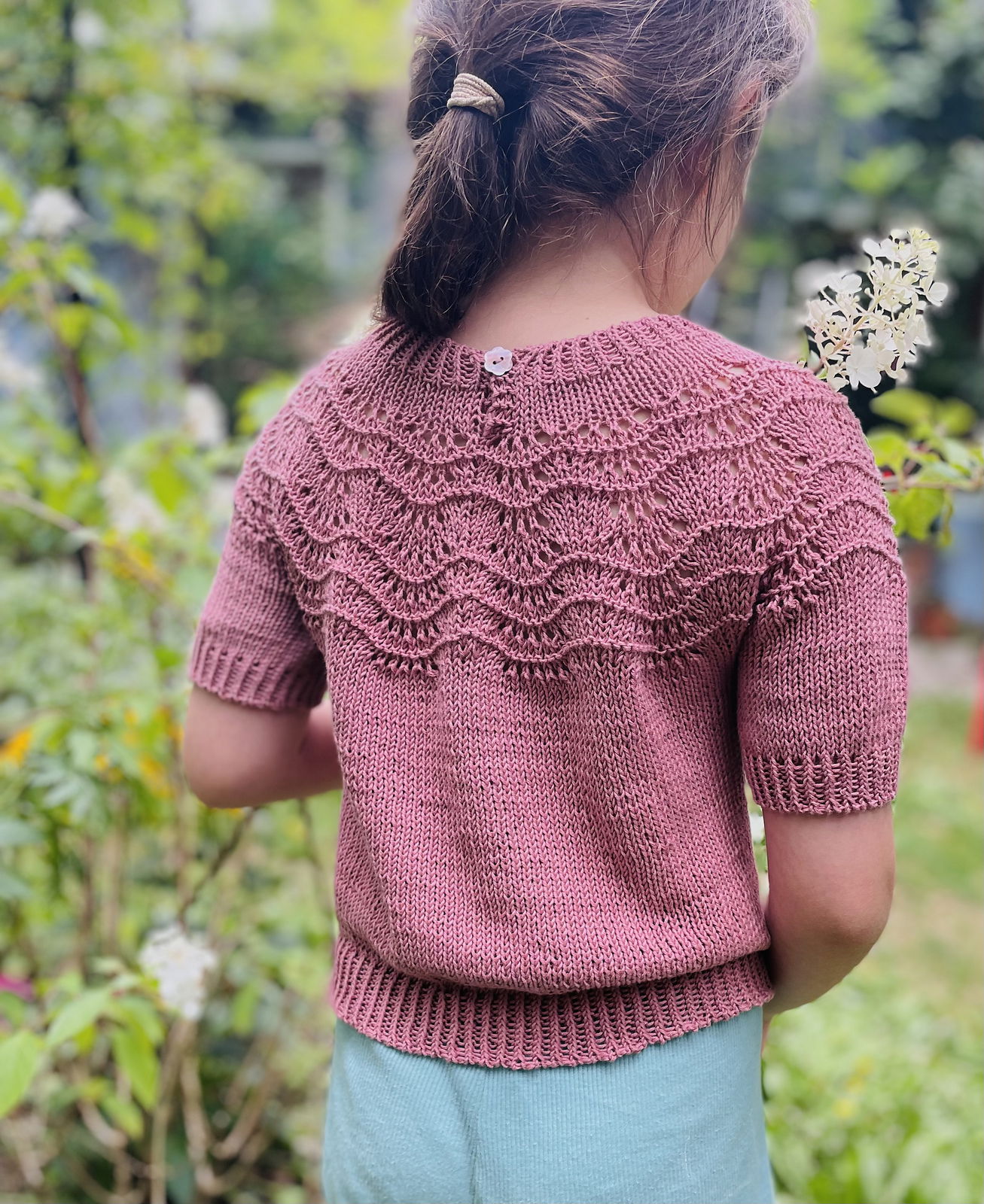 Work neck edge and yoke back and forth on circular needle from mid front, and work top down. When yoke is done, divide stitches for body and sleeves. Work body downwards back and forth on circular needle while putting the sleeves aside. Then work sleeves downwards in the round on needle.