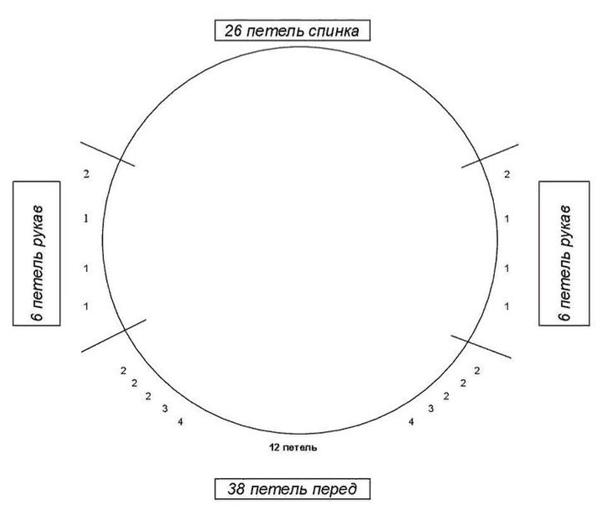 Спинка 26 п, Перед 38 п, рукава по 6 п