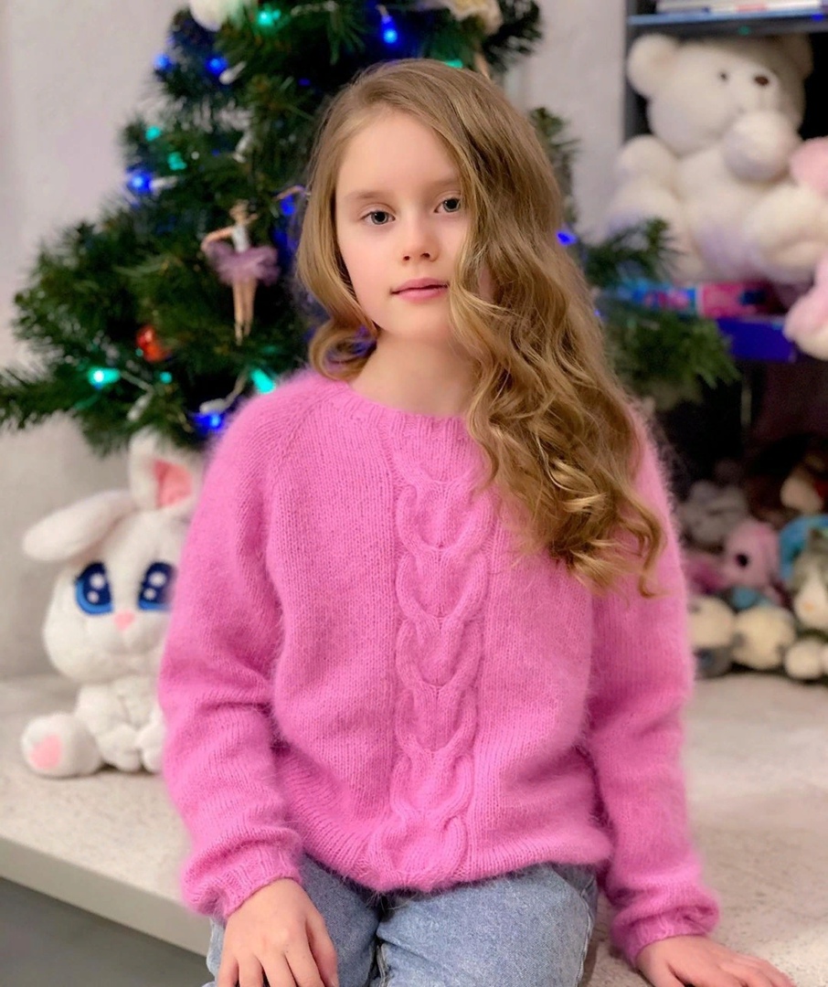 Пуловер детский с косой из ''пуха норки'', 1 осн + 1 всп нить. Расход - 130 гр на рост 122-128.