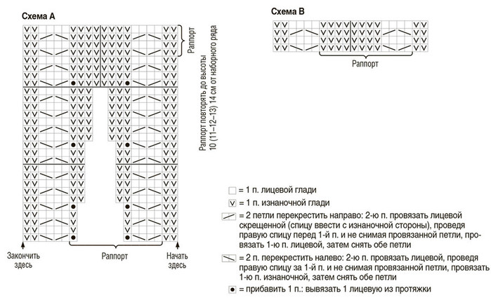Основной узор = структурные узоры а и в. Вязать последовательно по приведенным схемам А и В.