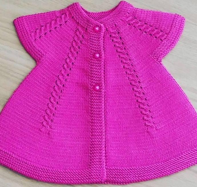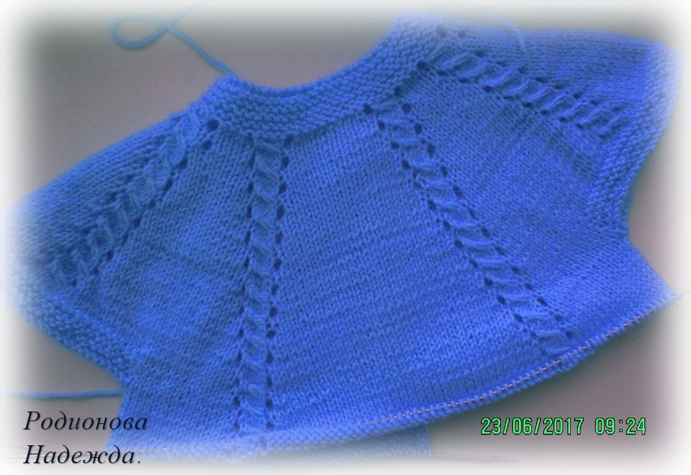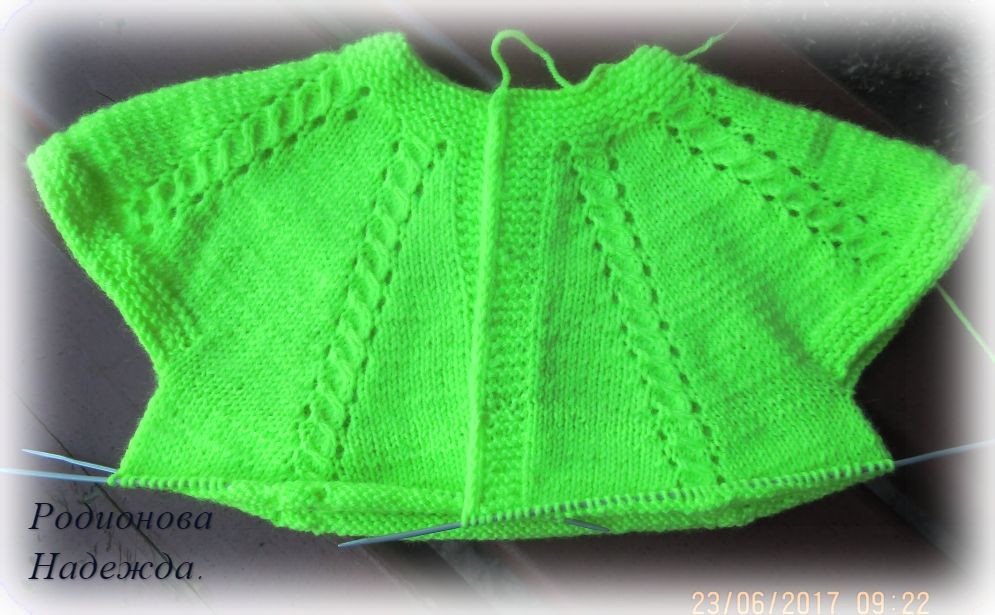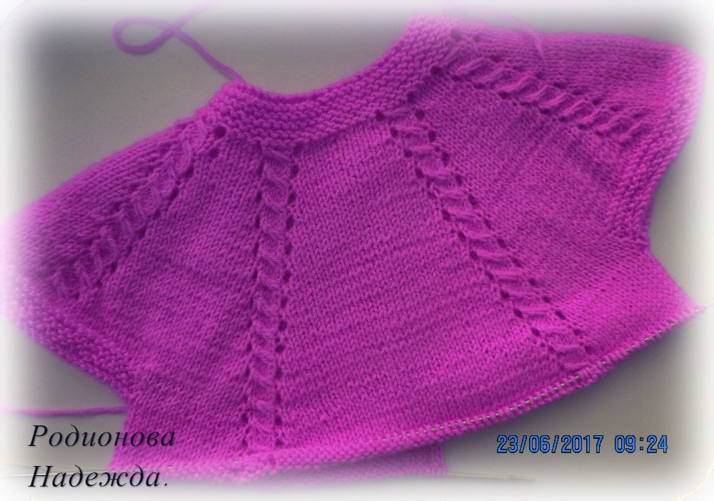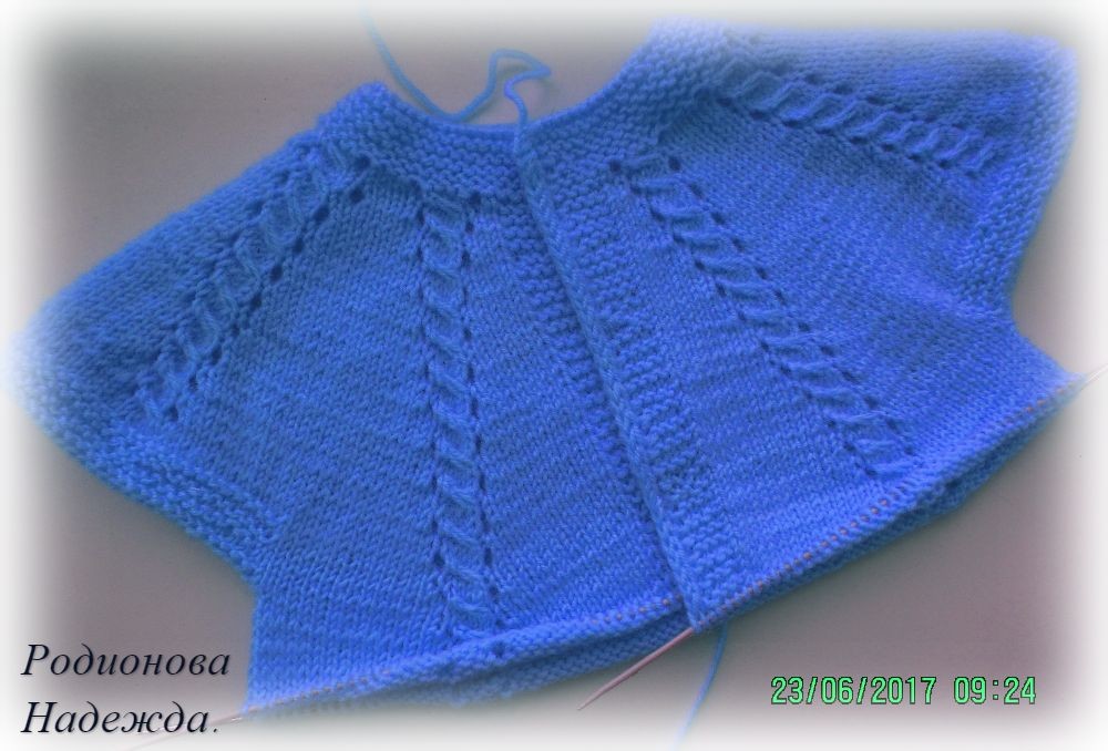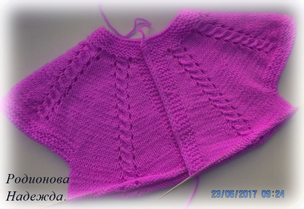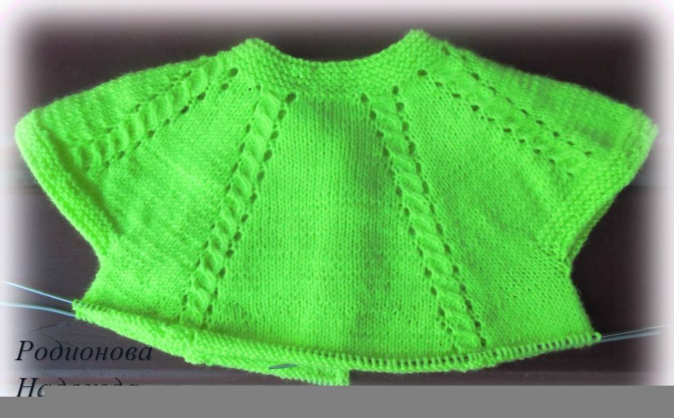 затем закрыть петли рукава, собрать передние полочки и спинку на одну спицу и продолжить вязать распашетку продолжая чередовать переплетения жгута и накидов до нужной Вам ширины.. оставшуюся длинну связать лицевой гладью и закончить вязание рядами платочной вязки..