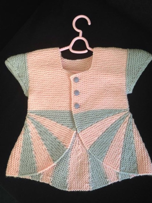 Описание этой жилетки или платьица, ну, в общем назовите так, кому как удобнее. Вещица полностью вязана платочной вязкой тремя частями: 1. два переда и юбочка, 2. спинка, 3. рукавчики. Дам сразу два размера: на 6-12 месяцев и на 12- 18 месяцев (в скобках будет размер побольше)). В двух платьицах я использовала разную пряжу, но по метражу почти одинаковые. Платье сине-голубых тонов связана пряжей Himalaya Enjoy, 50% бамбук, 50% детский акрил, антипиллинг, 250 гр в 100 м. А сиренево-розовое платьице из пряжи Kartopu Lemon, 100% акрил. Набираем на спицы 20 (21) петель и вяжем 14(15) рубцов пл.вязкой (1 рубец это 2 ряда, т.е одна полоска), затем набираем ещё 10 (12) петель, итого получилось 30 (33) петель. Дальше через 3 рубца делаем дырочку для пуговки (через каждые 8 рубцов не забываем делать дырочки, их должно быть 3 шт.) Привязав всего 21(22) рубцов, т.е в общей сложности 35 (37) рубцов добавляем дополнительный цвет. Дальше будем вязать дольки укороченными рядами. Дольки вяжем таким образом: добавив доп.нить вяжем 1 ряд, дальше вяжем только 27(30) петель и поворачиваемся назад, привязав до начала снова вяжем 24(27) петель и поворачиваемся назад..... Продолжаем так до 3 петель, затем вяжем полностью до начала и меняем нить. Таким образом вяжем 6 долек, затем вяжем 4 четырехугольника по 6 рубцов каждая, затем ещё одна долька. Теперь будем вязать треугольник по середине, для этого вяжем дольку, но только до 15 петель, затем провяжем полные два ряда, затем начнем зеркально вязать ещё до 15 петель, т.е на этот раз начнем поворачивать вязание с 3 петель (3, 6, 9, 12, 15), закончив центральный треугольник дальше вяжем зеркально вторую половинку. Дольки тоже вяжем зеркально,т.е начинаем на этот раз повороты с 3 петель. Это была 1 часть. Связав полотно двух передов и юбочки теперь будем вязать спинку. Набираем с центра полотна 54(60) петель вяжем 32(34) рубца, затем закрываем средние 14(18) петель и вяжем ещё по 3 рубца на каждой стороне. Итого 35(37) рубцов. Это была 2 часть. Теперь пришиваем плечики и начинаем делать рукавчики. По центру от плечевого шва считаем с обеих сторон по 25(26) петель, отмечаем маркером. Набираем на спицы эти 50(52) петель. Обрываем нить, перекидываем первые 20 петель на правую спицу не провязывая. Вяжем только средние 10(12) петель постепенно добавляя в каждом ряду по 2 петли до окончания петель с краев, закрываем все петли. Вот и все! Пришиваем бока под рукавами, если хотите, то обвяжите изделие крючком видео по которому связаны изделия, на турецком, но видео поможет вам подсмотреть нюансы, просто отключите звук. Легких петелек всем!