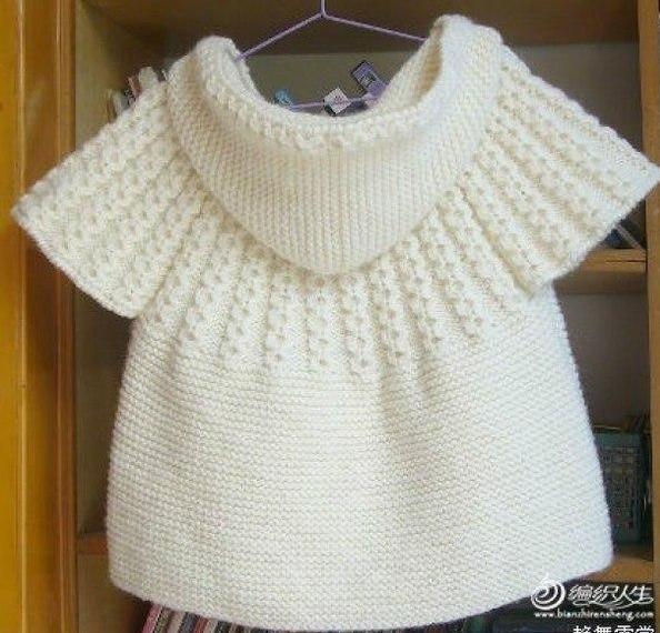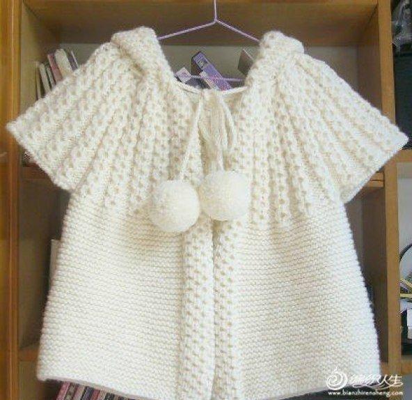 Белый жилет с капюшоном для девочкиKlubokhttp://klubok.work/23/183/7647/Klubokhttps://klubok.work/css/image/top-logo-en.pngДля вязки такого симпатичного жилета понадобится 250 грамм полушерстяной нити белого цвета, спицы №3. Наберите на спицы 200 петель. Сначала 10 петель провяжите — это планка. Ее можно вязать любым способом, который вам нравится: «соты», «шишечки» и так далее. Затем 180 петель ввыполните платочной вязкой: все лицевые петли за заднюю стенку. Оставшиеся 10 петель провяжите снова узором для планки. Так выполняйте ровно 60 рядов. Теперь приступаем к вязанию кокетки. Ниже показано, как делать косы «с дырочками» — на каждом пятом ряду 2 петли через одну, а потом добавляя по рисунку снова 2 петли. Рукава следует вязать отдельно, а потом пришить или привязать их к кокетке. Отдельно вяжите и капюшон: наберите на спицы 100 петель, провяжите платочной вязкой 30 рядов и закончите. Пришейте капюшон к кокетке, вставьте нить с помпонами — жилетка готова.