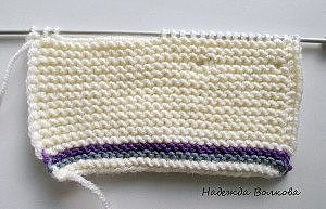 Для спинки набираю 48 петель молочным цветом и вяжу 1 ряд, меняю нить на серый и вяжу 2 ряда серым, потом 2 ряда фиолетовым. Дальше продолжаю вязать молочным цветом на 48 петлях платочной вязкой до высоты примерно 18 см от начала вязания.