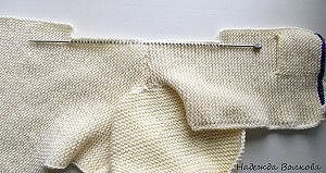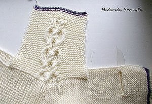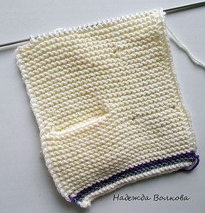 Плечо закрываю, в вороте провязываю накиды вместе с соседней петлей. Петли ворота не закрываем, а оставляем на спице, спинка готова Для полочки набираю 31 петлю. молочным цветом и вяжу 1 ряд, меняю нить на серый и вяжу 2 ряда серым, потом 2 ряда фиолетовым. Дальше продолжаю вязать молочным цветом на 31 петле платочной вязкой до высоты примерно 7 см. Следующий лицевой ряд вяжу так:1 лиц, 2 вместе лиц, накид, 7 лиц, 2 вместе лиц, накид, и до конца провязываем лицевыми, в изнаночном ряду накиды провязываем тоже лицевыми.Получились у нас петельки для пуговиц. Такие ряды с петельками я повторяю еще через каждые 7 см. Провязав от края 8,5 см, вяжу лицевой ряд следующим образом: 16 петель провязываю лицевой, 12 петель закрываю и оставшиеся 3 петли тоже провязываю лицевыми. Т.о у нас получилось отверстие под карман. Теперь нам необходимо связать сам карман (это будет его внутренняя часть, как бы подкладка).
