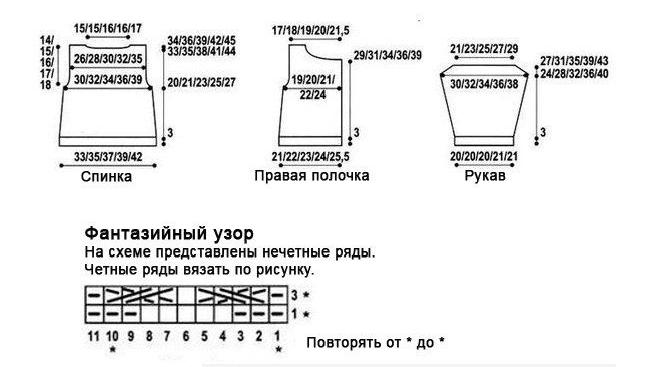 Набрать на спицы 31/31/31/33/33 п. и связать 8 рядов платочной вязкой. Продолжить вязание фантазийным узором, начиная с 1-й/1-й/1-й/10-й/10-й петли схемы. Прибавить с обеих сторон: для Р1 в каждом 6-м ряду 9 раз 1 п., для Р2 в каждом 6-м ряду 2 раза 1 п., в каждом 4-м ряду 8 раз 1 п., для РЗ в каждом 6-м ряду 2 раза 1 п., в каждом 4-м ряду 10 раз 1 п., для Р4 в каждом 6-м ряду 7 раз 1 п., в каждом 4-м ряду 5 раз 1 п., для Р5 в каждом 6-м ряду 7 раз 1 п., в каждом 4-м ряду 7 раз 1 п. (итого 49/51/55/57/61 п.). На общей высоте 24/28/32/36/40 см для оката рукава закрыть с обеих сторон в каждом 2-м ряду: 2 раза 3 п., 1 раз 2 п., затем закрыть оставшиеся 33/35/39/41 /45 п.