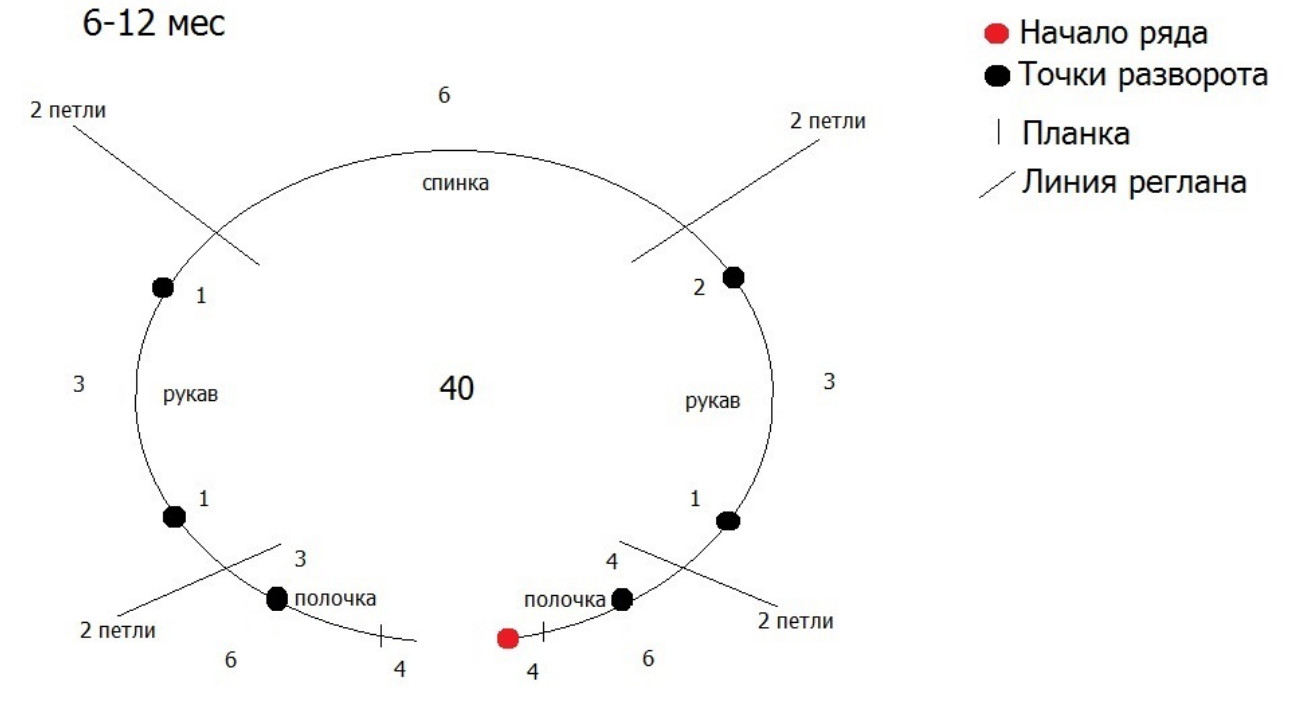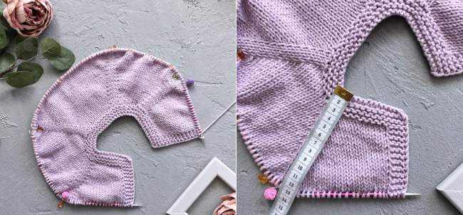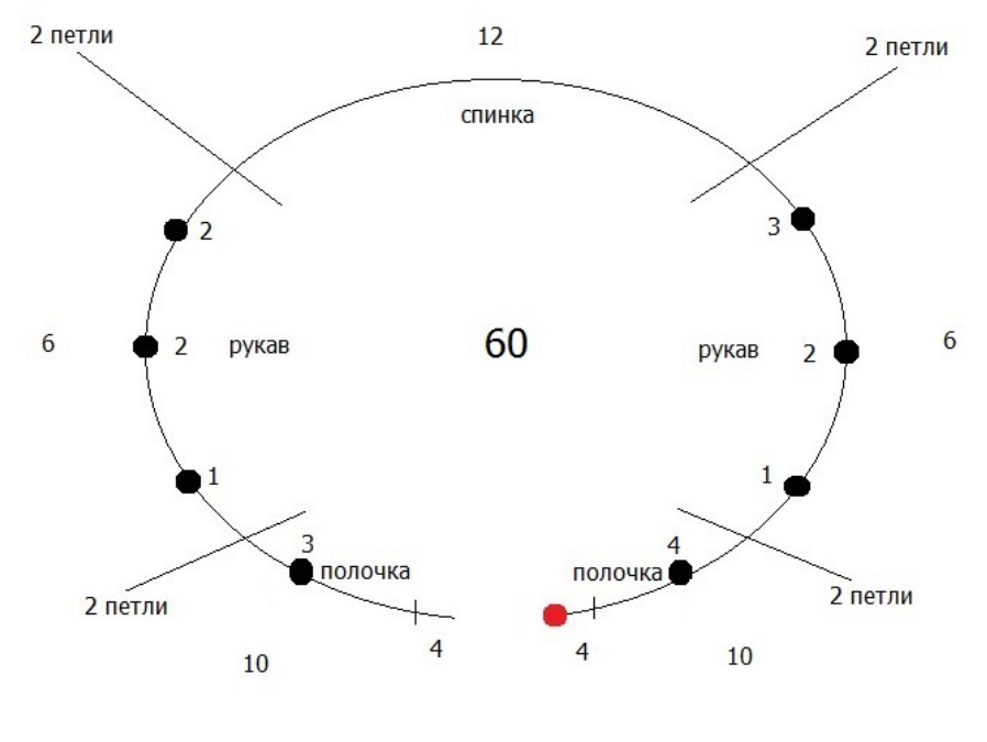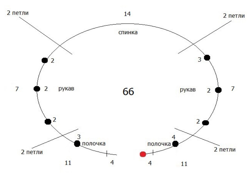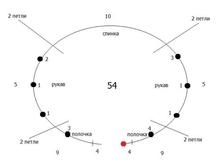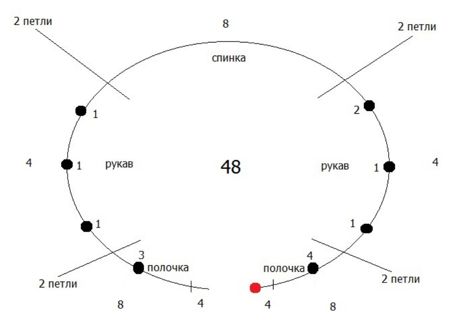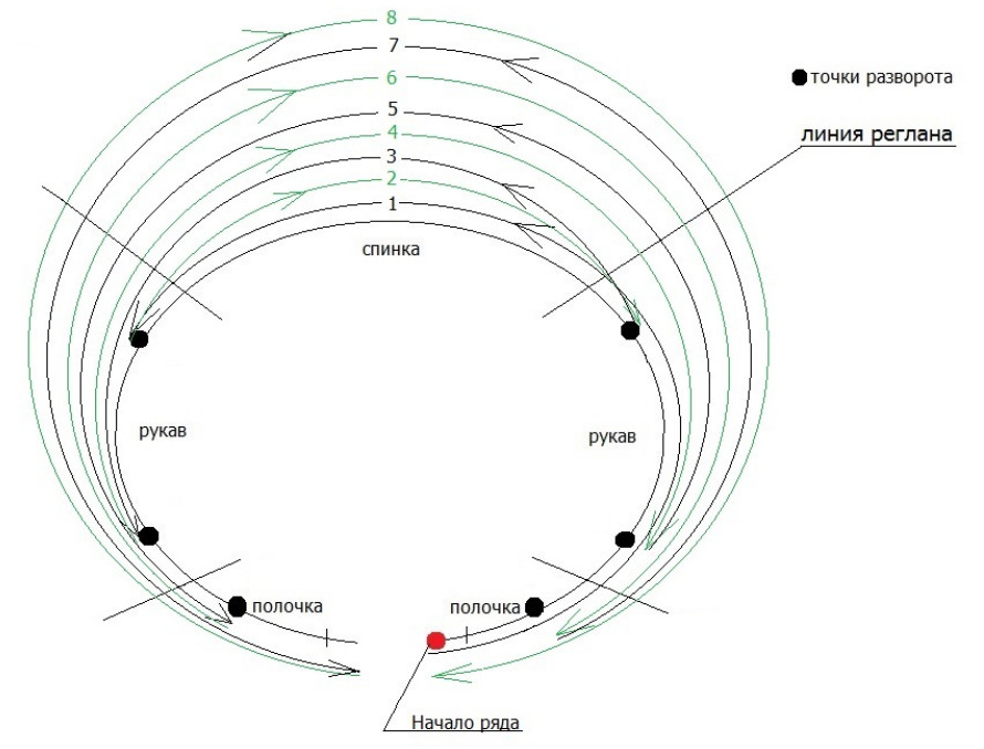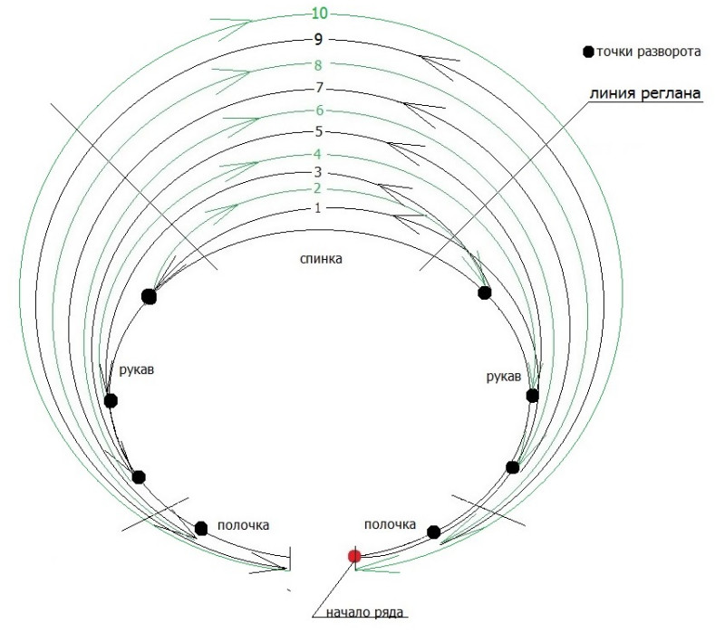 Когда регланная линия достигнет нужной вам длины, необходимо разделить все петли на полочки, спинку и рукава.
