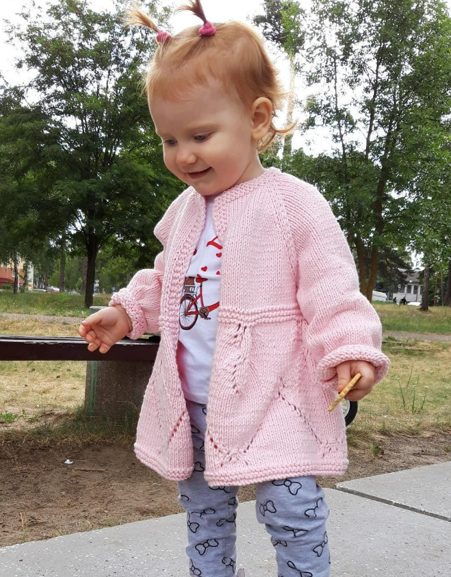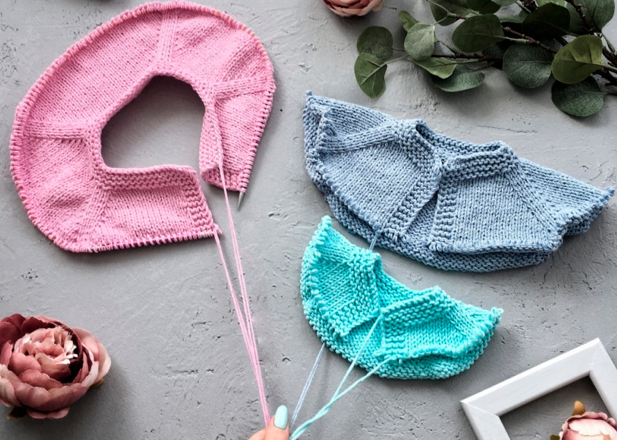 Из первых 2 (1 петля для размера 6–12 мес.) петель подреза вытягиваем крючком или спицей 2 (1) петли. Дополнительно между подрезом и открытыми петлями рукава набираем ещё 2 петли, чтобы избежать появления дырочек. Провязываем петли рукава лицевыми, между открытыми петлями и подрезом набираем ещё 2 петли, из последних 2 (1) петель подреза вытягиваем 2 (1) петли. Наше вязание замкнулось в круг. Итого мы добавили 8 (6) петель к петлям рукава.