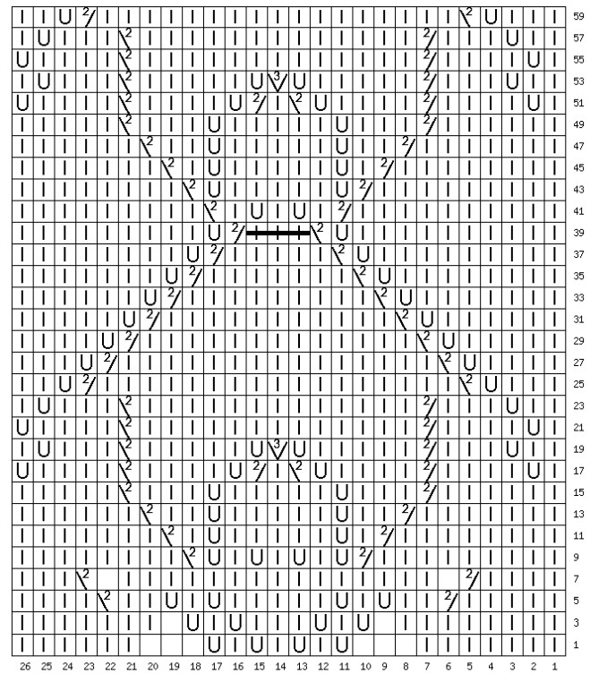 25 ряд: 3 лиц.п., накид, 2 п. вместе лиц. с наклоном влево, 17 лиц.п., 2 п. вместе лиц. с наклоном вправо, накид, 2 лиц.п. — повторять до конца ряда.