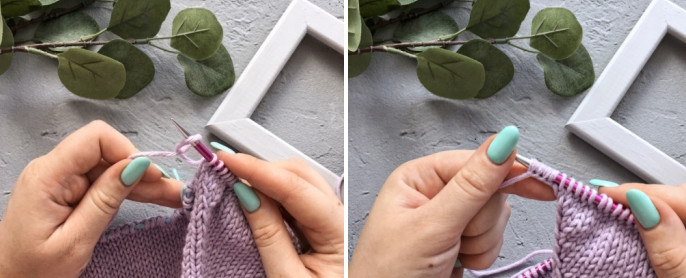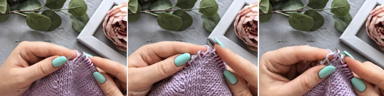 Те же действия повторяем при вязании в изнаночном ряду, только когда перекидываем петлю с левой спицы на правую, рабочая нить находится сзади — переводим её вперёд и тянем на себя, пока не перевернётся петля.