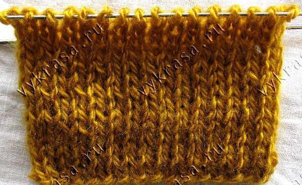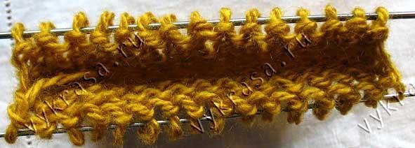 1-й ряд — кромочная петля, * провязать одну петлю лицевой, вторую изнаночной петлей *, кромочная.