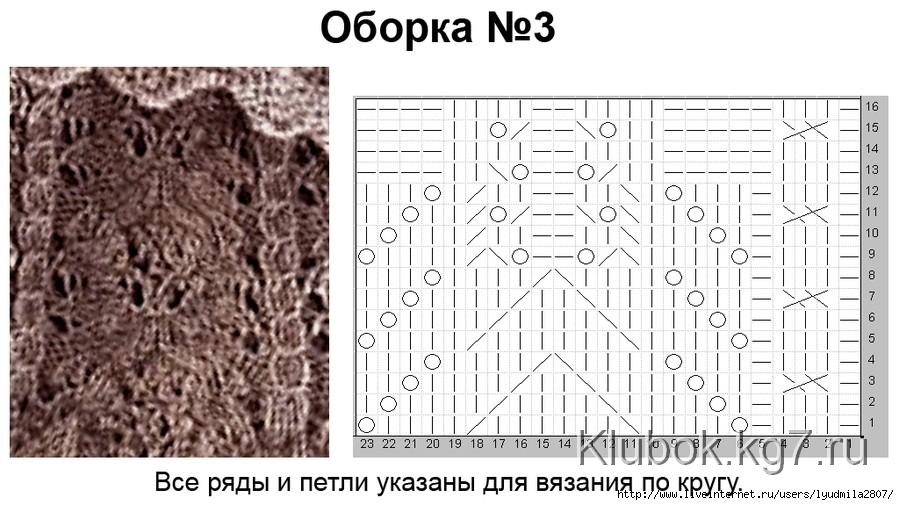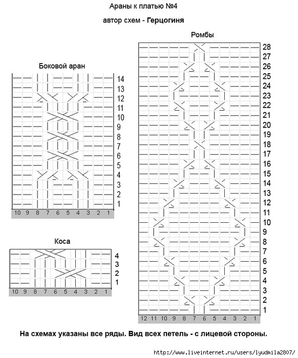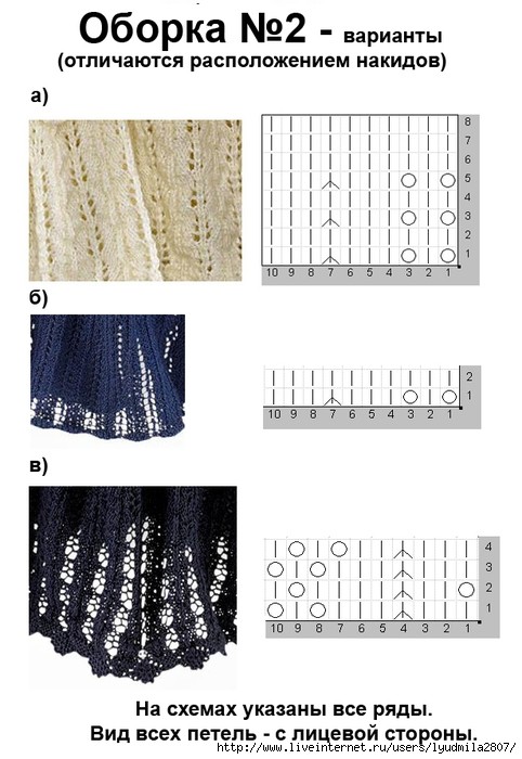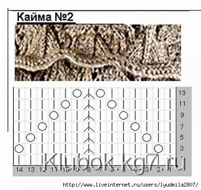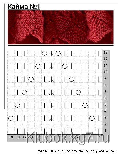 The sleeve is knitted in a regular rib pattern (1 knit, 1 purl, in the reverse row purl over knit stitches and knit over purl stitches. First, I determined the width - i.e., I estimated by eye to make the width not exactly according to the arm's volume, but loosely, and cast on stitches for the trim twice the required width. Then I knitted the trim and knitted a row of two stitches together (i.e., I halved the number of stitches). Then 4 rows of garter stitch, one row for holes - (knit two together, yarn over - repeat to the end of the row), then another 4 rows of garter stitch and in the next row I doubled the number of stitches (knitted 1 knit and one from the yarn over twisted knit), and then I started to knit in rib pattern. The cord is twisted from the same yarn. I found the trim for the sleeves and neckline online - here is the scheme