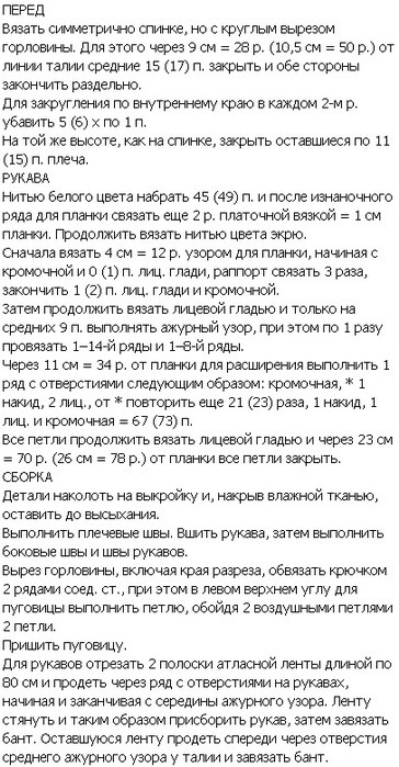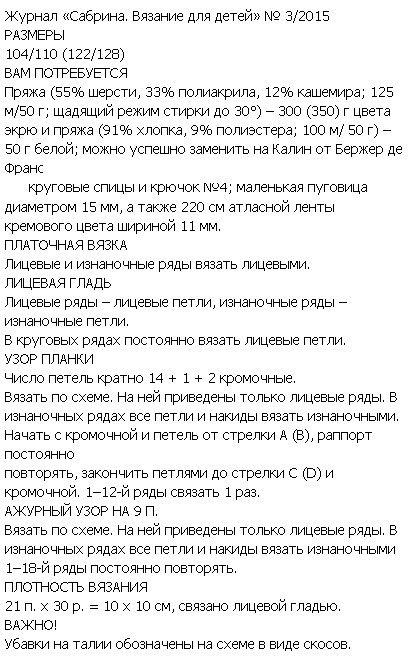 Для этой туники вам понадобится ещё ажурная лента, которая продета в рукава и под грудью. Сзади туника застегивается на одну пуговицу. Описание туники приведено для следующих размеров: 104/110 и 122/128. Такую тунику маленькая модница может с удовольствием носить с брючками или лосинами. Как связать тунику для девочки спицами смотрите далее в статье.